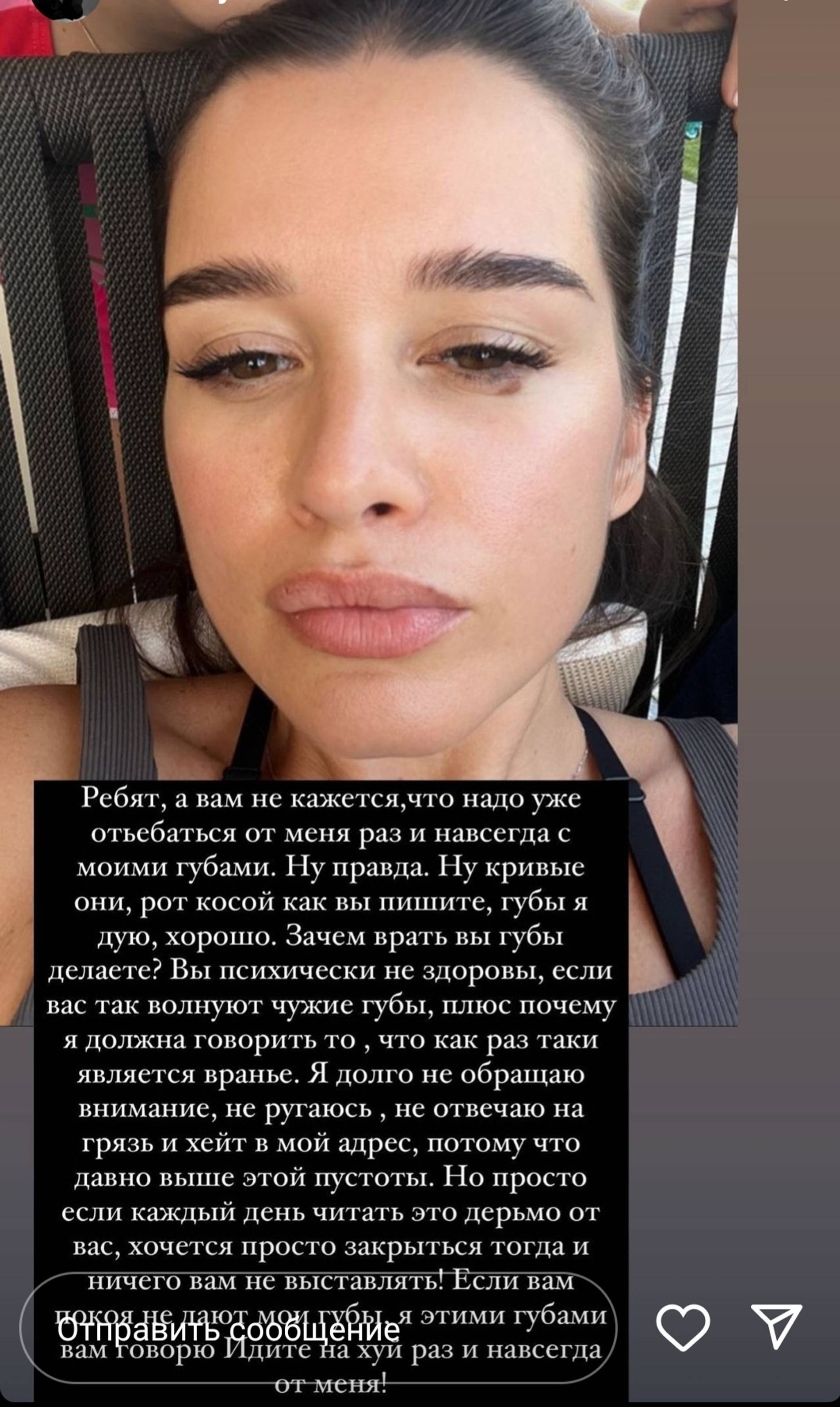 «А вам не кажется, что надо уже отъ... ся раз и навсегда от меня с моими губами? Ну кривые они, рот косой, как вы пишете, губы я дую, хорошо. Зачем врать, мол, вы губы делаете? Вы психически нездоровы, раз вас так волнуют чужие губы. Плюс, почему я должна говорить то, что как раз-таки является враньем. Я долго не обращаю внимание, не ругаюсь, не отвечаю на грязь и хейт в мой адрес, потому что давно выше этой пустоты. Но просто, если каждый день читать это дерьмо от вас, то просто хочется закрыться и ничего вам не выставлять!» — возмущается ведущая.