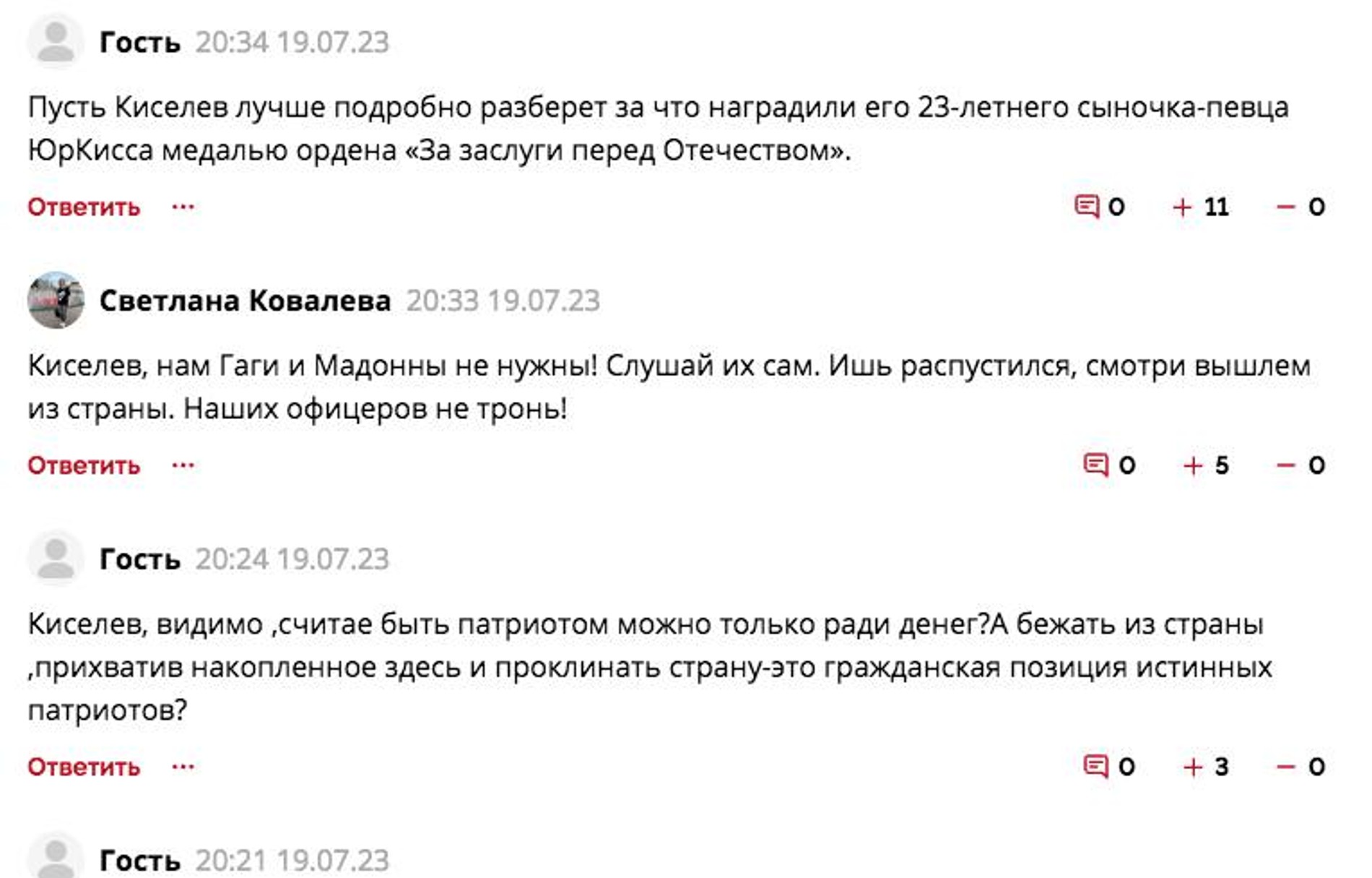 Однако интернет-пользователи встали на сторону исполнителя хита «Ясные дни», а Владимира Киселева обвинили в двуличности и усомнились в его патриотической позиции. Например, читатели StarHit под материалом с отрывками скандального послания пишут, что творчество певца и композитора проверено временем: четвертый десяток лет песни Газманова поет вся страна. Обидчика же поклонники называют «примитивным завистником, возомнившим себя вершителем судеб». Также читатели призывают Владимира Киселева жить дружно: «не кидаться на своих» и прекратить нападки на Олега Газманова.
