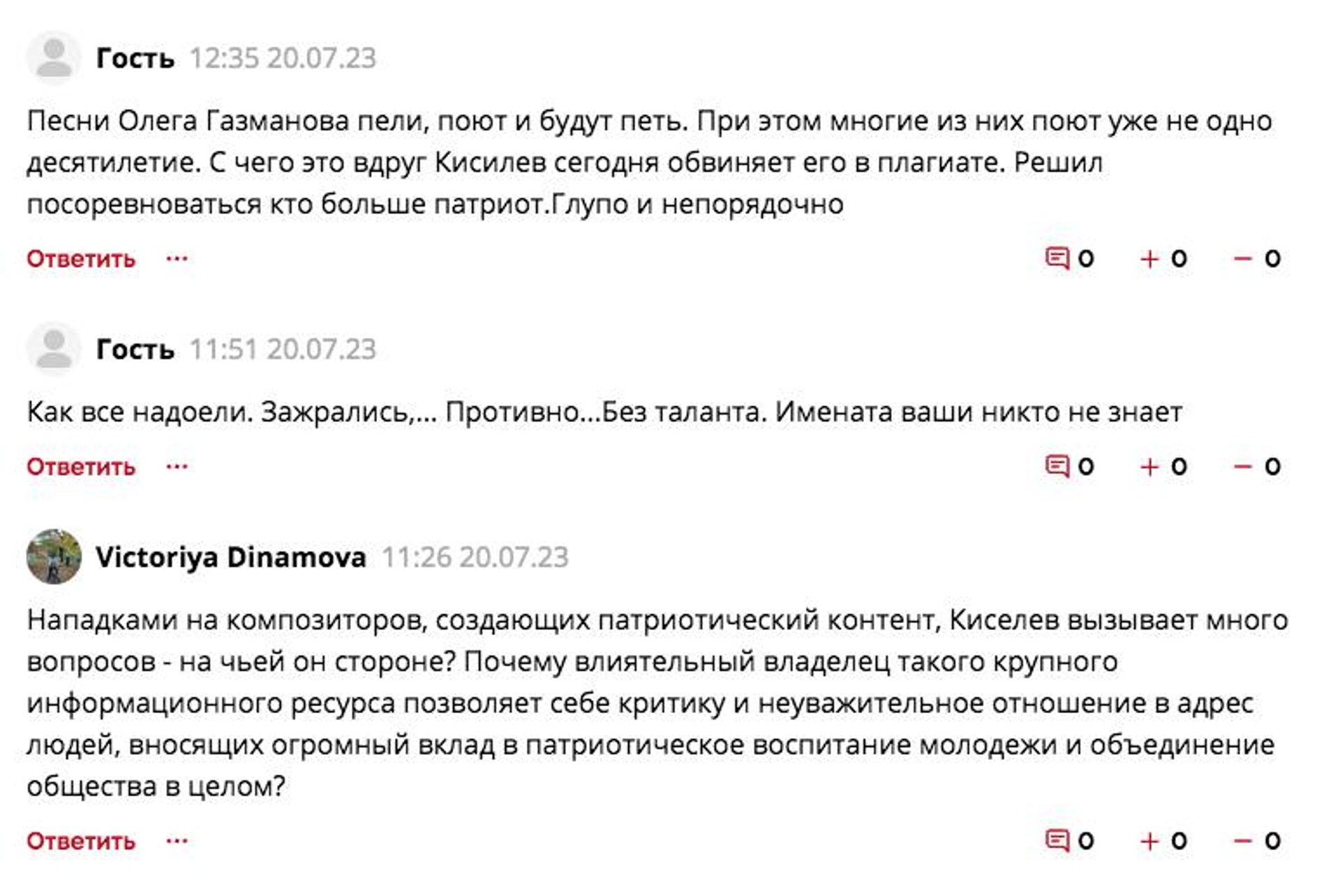 Также бизнесмен высказался об отсутствии у Газманова таланта. «Неуважаемый мною композитор Газманов. Я хотел бы поделиться с вами рядом соображений. Может быть, они помогут вам немного более реалистично относиться к своему творчеству и не держать ваших коллег и слушателей за идиотов. Неужели думаете, что никто не понимает, что вы скармливали своей аудитории на протяжении 36 лет?! Прямые маршеобразные ритмы, с явно выраженными слабыми второй, четвертой долями и гармониями в стиле "Ласковый май", вряд ли дают право именоваться композитором в полном понимании этого слова», — рассуждает Владимир Киселев в письме, адресованном Олегу Газманову.