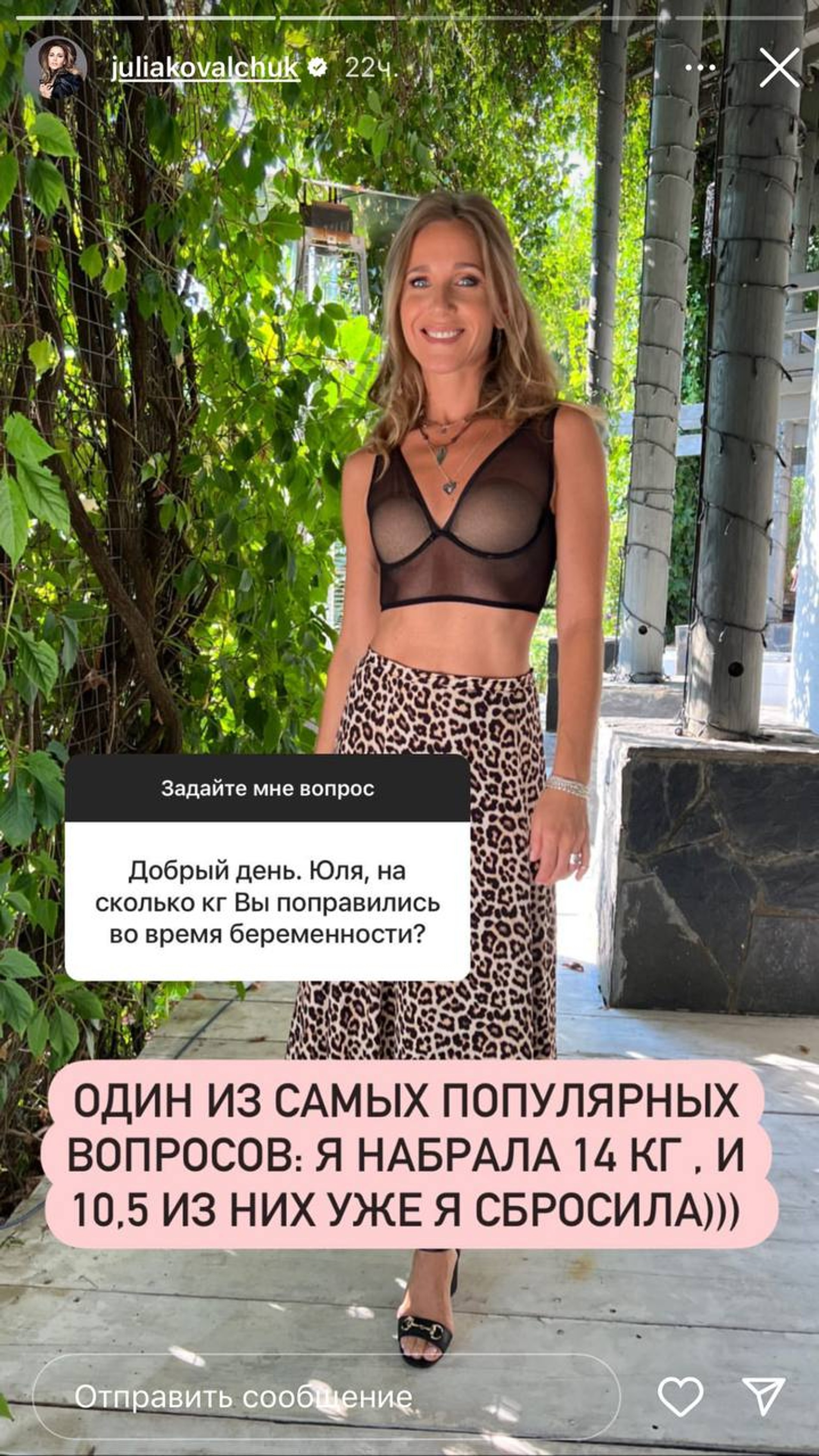На вопрос о том, на сколько певица поправилась за прошедшие девять месяцев, она честно ответила — на 14 килограммов. Фолловеры всерьез озадачились. Ведь по родившей три недели назад экс-блестящей вряд ли можно заметить такой набор веса. Оказывается, все дело в активном восстановлении. «10,5 из них я уже сбросила», — хвалится Ковальчук.