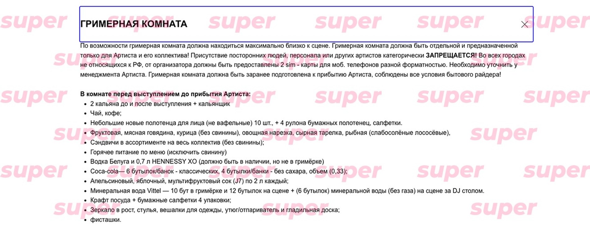 Переходим к самому интересному — гримерной комнате. Там у Джигана в обязательном порядке должны быть два кальяна до и после выступления, а также персональный кальянщик. В еде Денис не особо привередлив, разве что в блюдах не должна присутствовать свинина. Указано в райдере и то, что в наличии должны быть крепкие алкогольные напитки (но не в гримерке). Источники нашептали Super, что этот пункт теперь неактуален, ведь Денис с недавних пор не пьет (даже пиво).