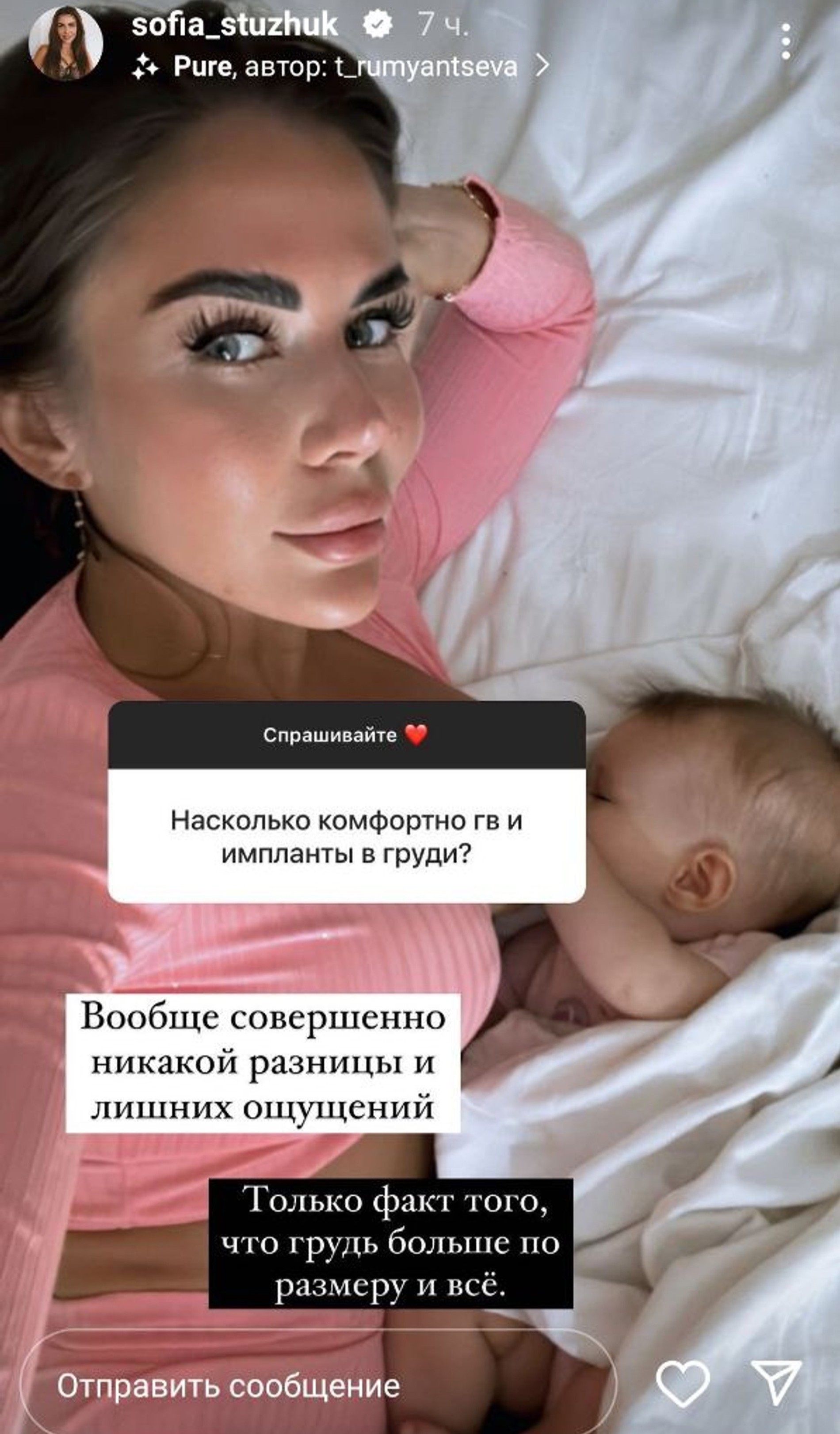 На днях же маму четверых детей спросили, каково кормить ребенка силиконовой грудью? И снова девушка честно и терпеливо ответила своей аудитории, препятствуют ли импланты процессу грудного вскармливания. «Вообще никакой разницы и лишних ощущений. Только грудь по размеру больше и все», — лаконично написала в сторис блогер.