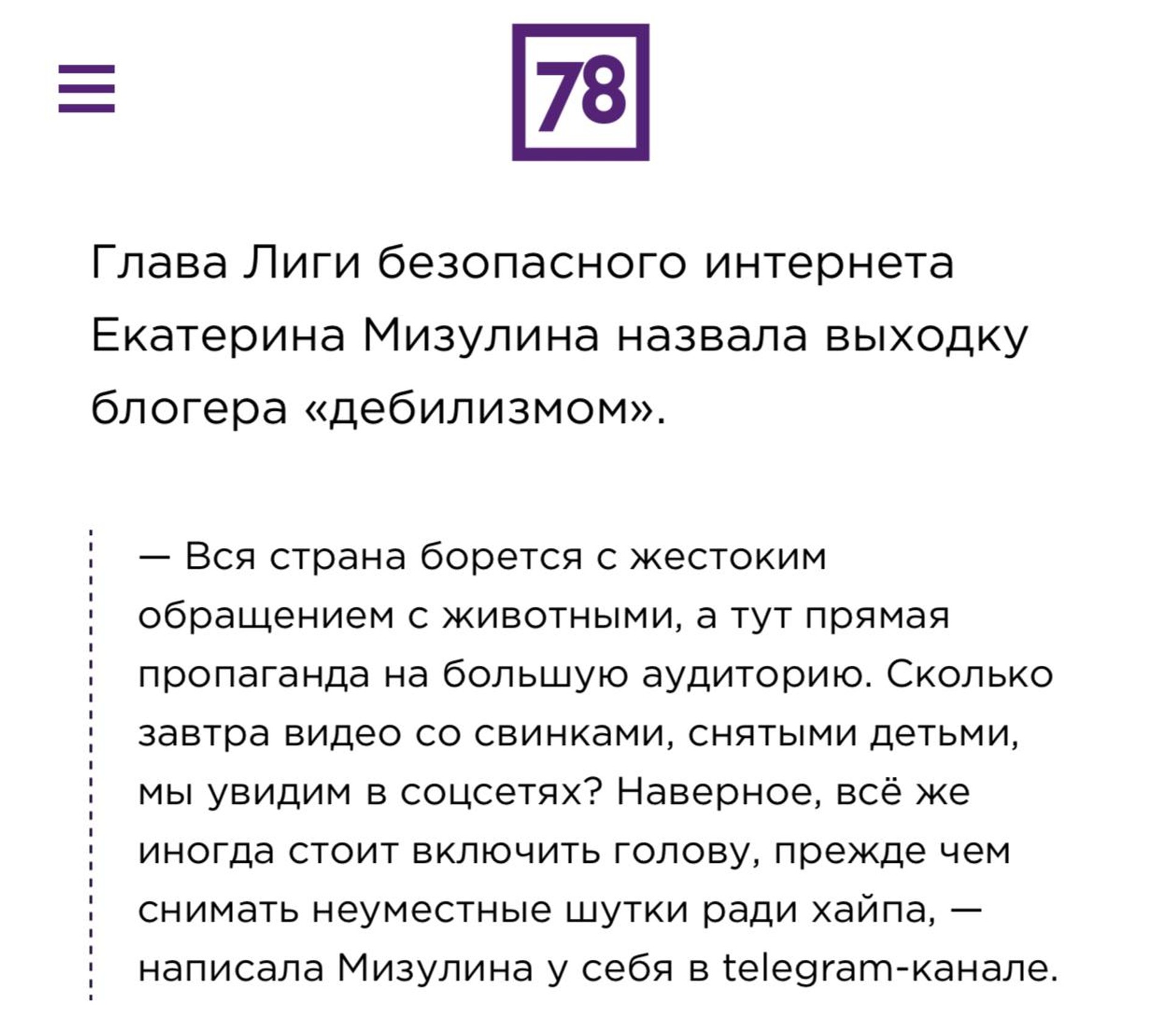 «К главным новостям дня. Не смотрела выпуск и не уверена, что дети стали бы поголовно перегрызать хомячкам и свинкам шеи, но госпожа Мизулина на то и кудесница, чтобы доводить ситуацию до абсурда»