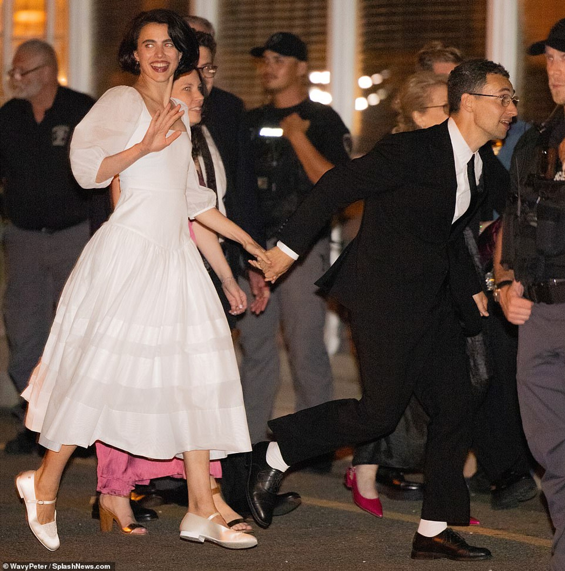 Сама Маргарет тоже не стала заморачиваться с обувью на высоком каблуке и выбрала белые атласные балетки с ремешком. Надо сказать, они отлично смотрелись с простым, но при этом изысканным подвенечным платьем (а ведь прав был Александр Рогов: американская пройма — один из главных трендов лета!). Правда, уже на вечеринке актриса сменила его на очень милый кукольный наряд с рукавами-фонариками — получилось очаровательно, ну прямо настоящая Белоснежка. Возможно, где-то сейчас кусает локти один Пит Дэвидсон — и, в принципе, мы его понимаем.
