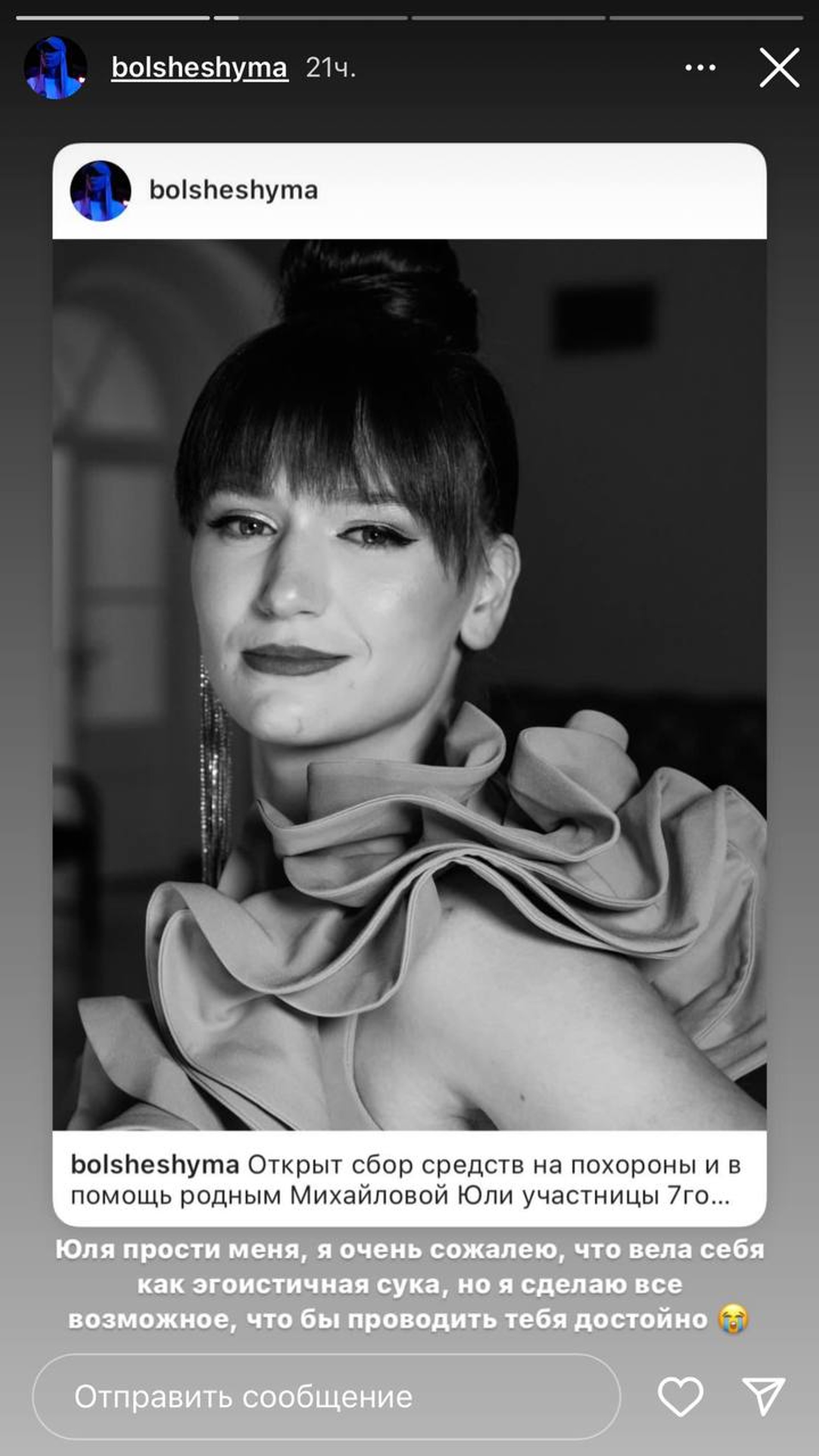 В сторис Захарова обратилась к покойной и добавила, что теперь сделает все возможное, лишь бы достойно проводить ее: она организовала сбор средств для похорон своей «одноклассницы».