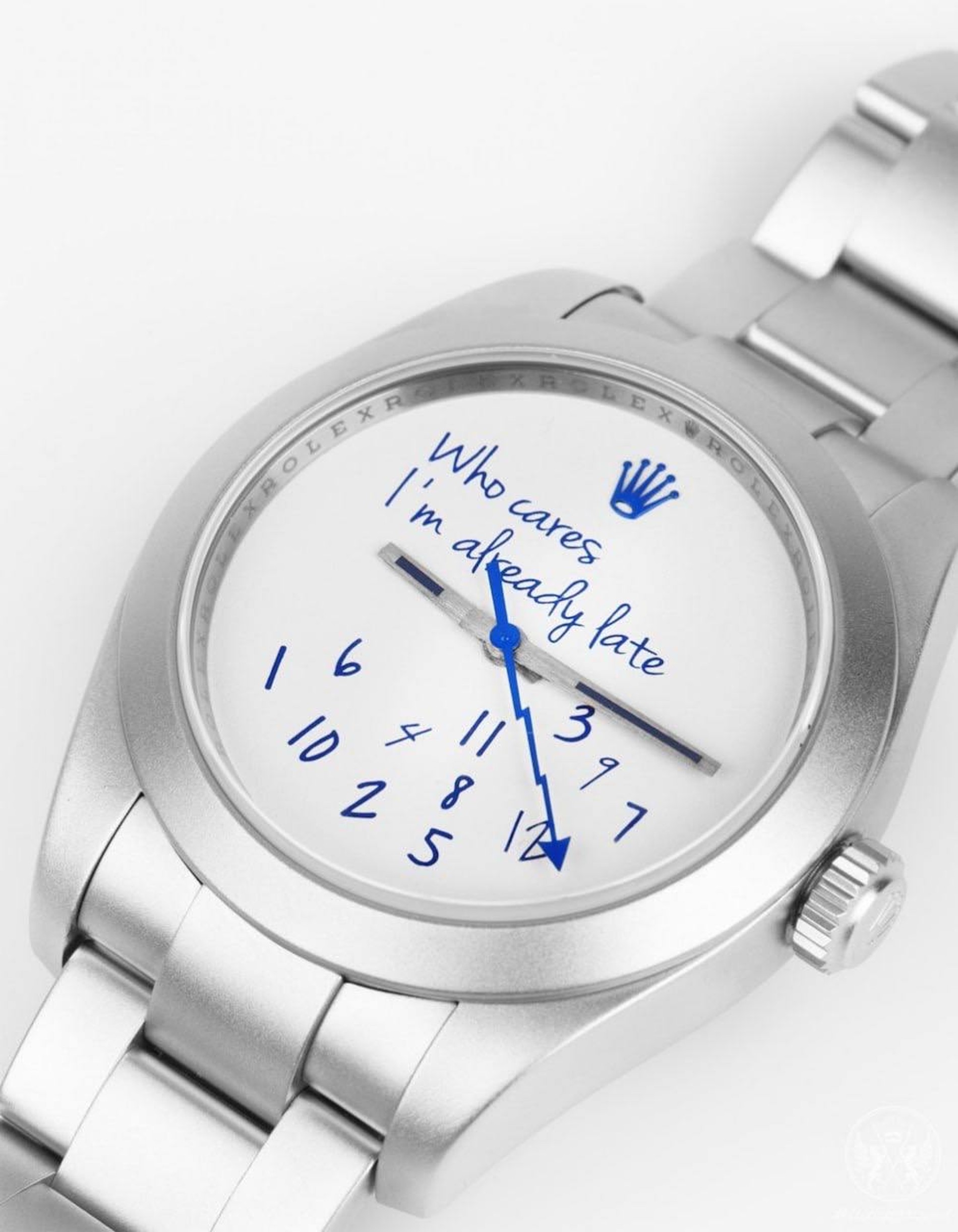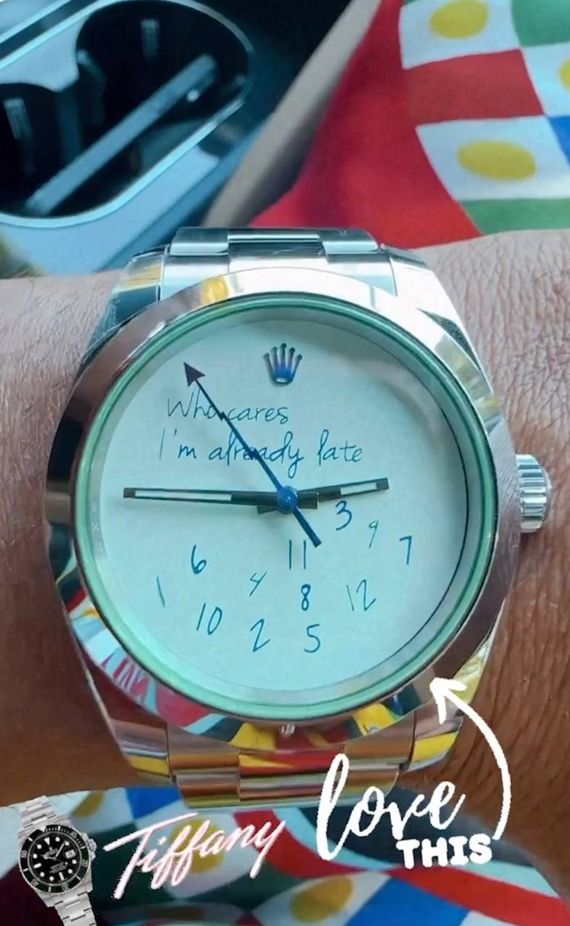 Разъезжая по солнечному Сочи перед выступлением, Киркоров похвастался в Инстаграме (запрещен в РФ) своими обновками. Артист показал новые эксклюзивные часы Rolex — совместное детище бутика Colette и часовой студии MAD Paris. На кастомизированной версии часов Rolex Milgauss вместо циферблата идеальная надпись для тех, кто любит опаздывать: Who cares I’m already late («Какая разница, я уже опоздал»).