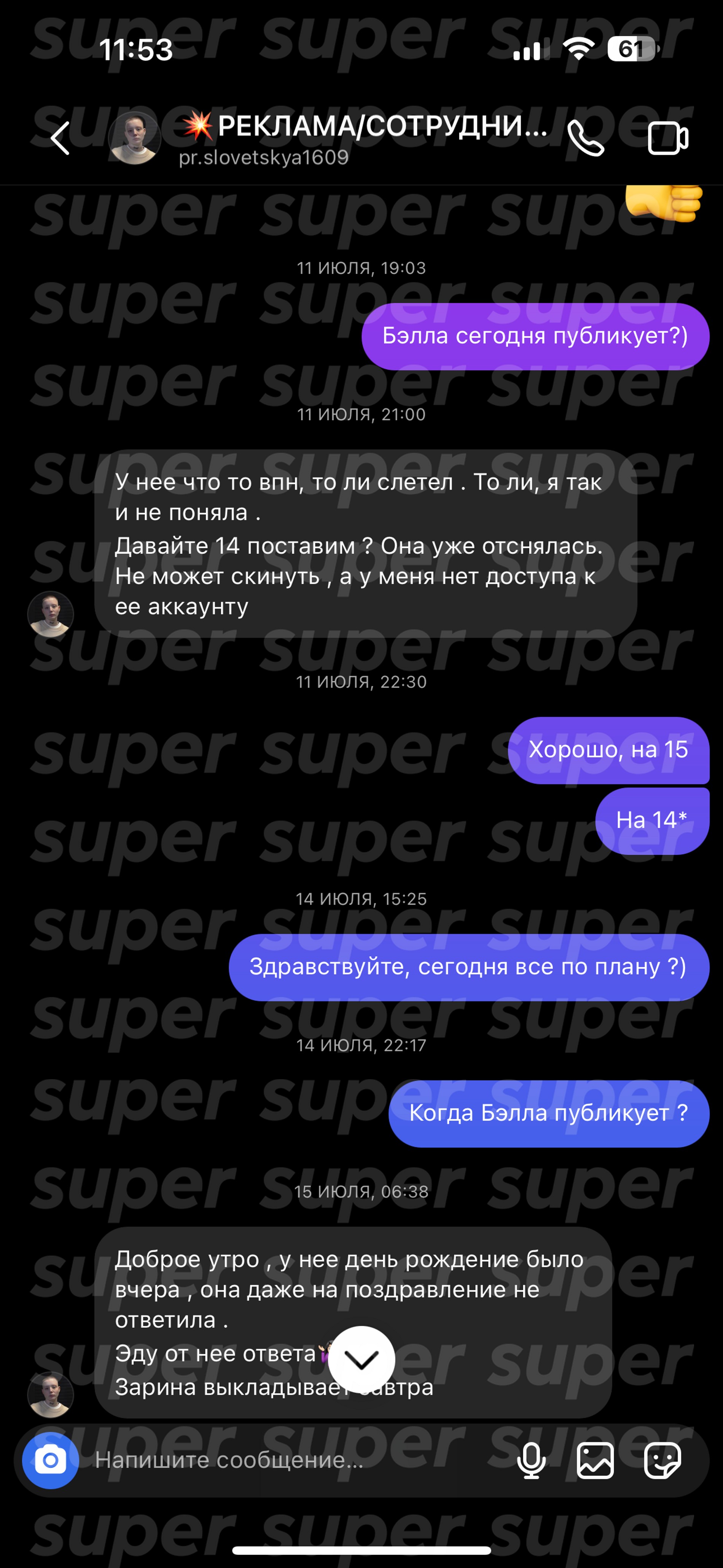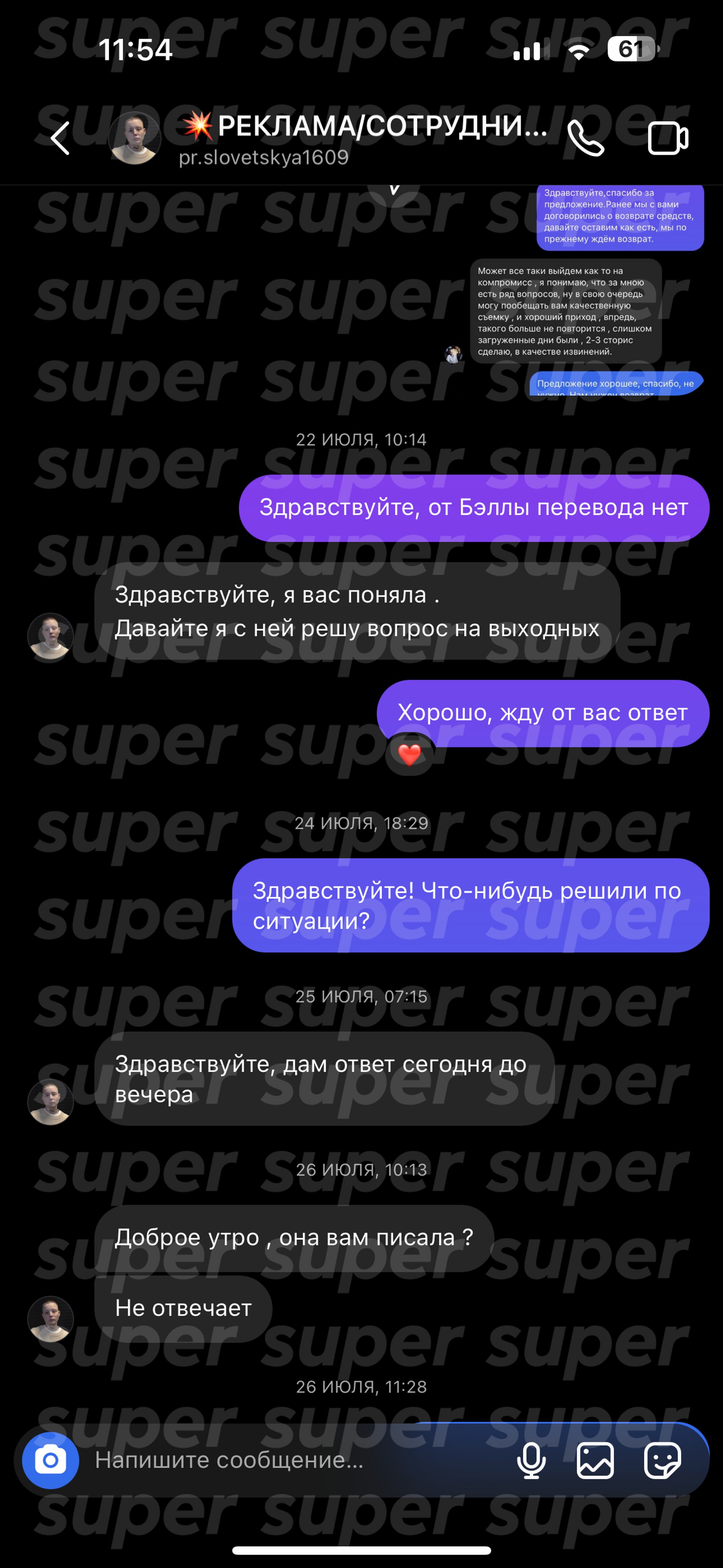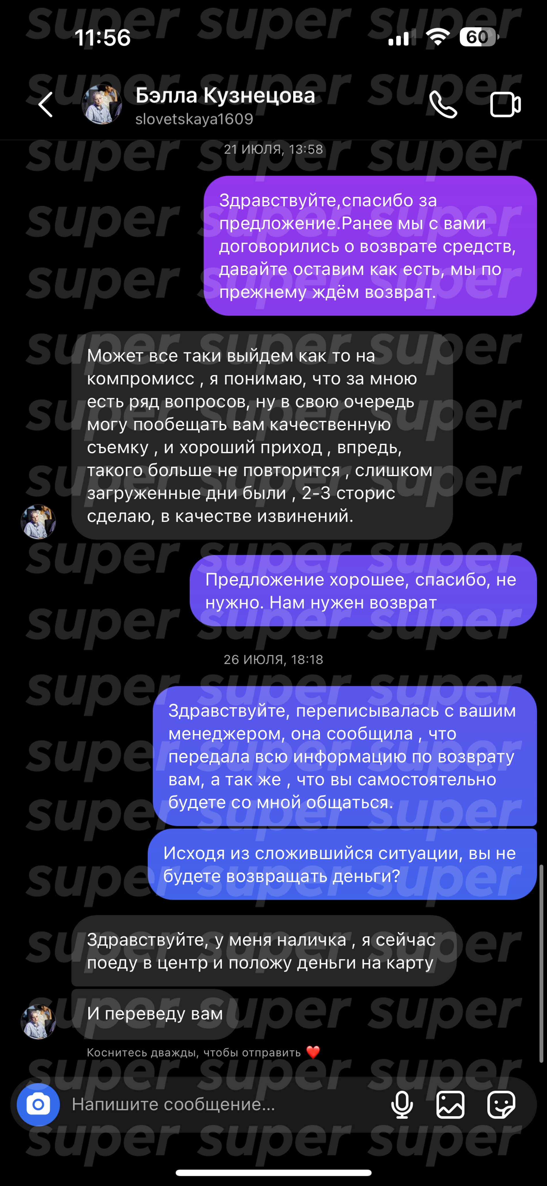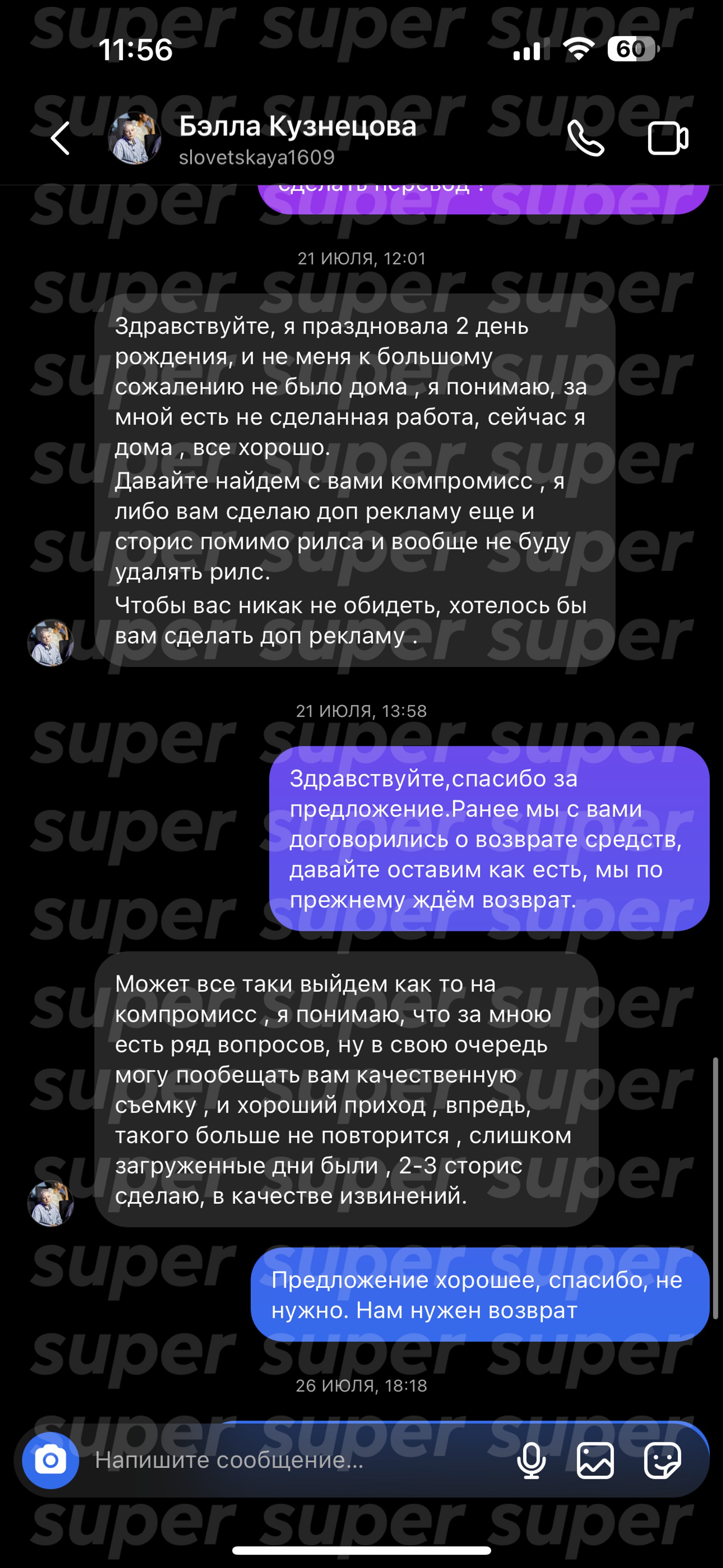 Когда обещанный срок публикации истек, Кузнецова вернулась к подписчице с порцией отговорок. В разговоре с Кристиной она заявила, что не смогла вовремя выложить рекламу из-за празднования дня рождения. В качестве компенсации Бэлла предложила заказчице дополнительную серию постов в Инстаграме (запрещен в РФ) и опцию «не удалять публикацию» на странице. Только вот для самой Кристины предложение оказалось уже не актуально. Тогда девушка потребовала возврат денег.