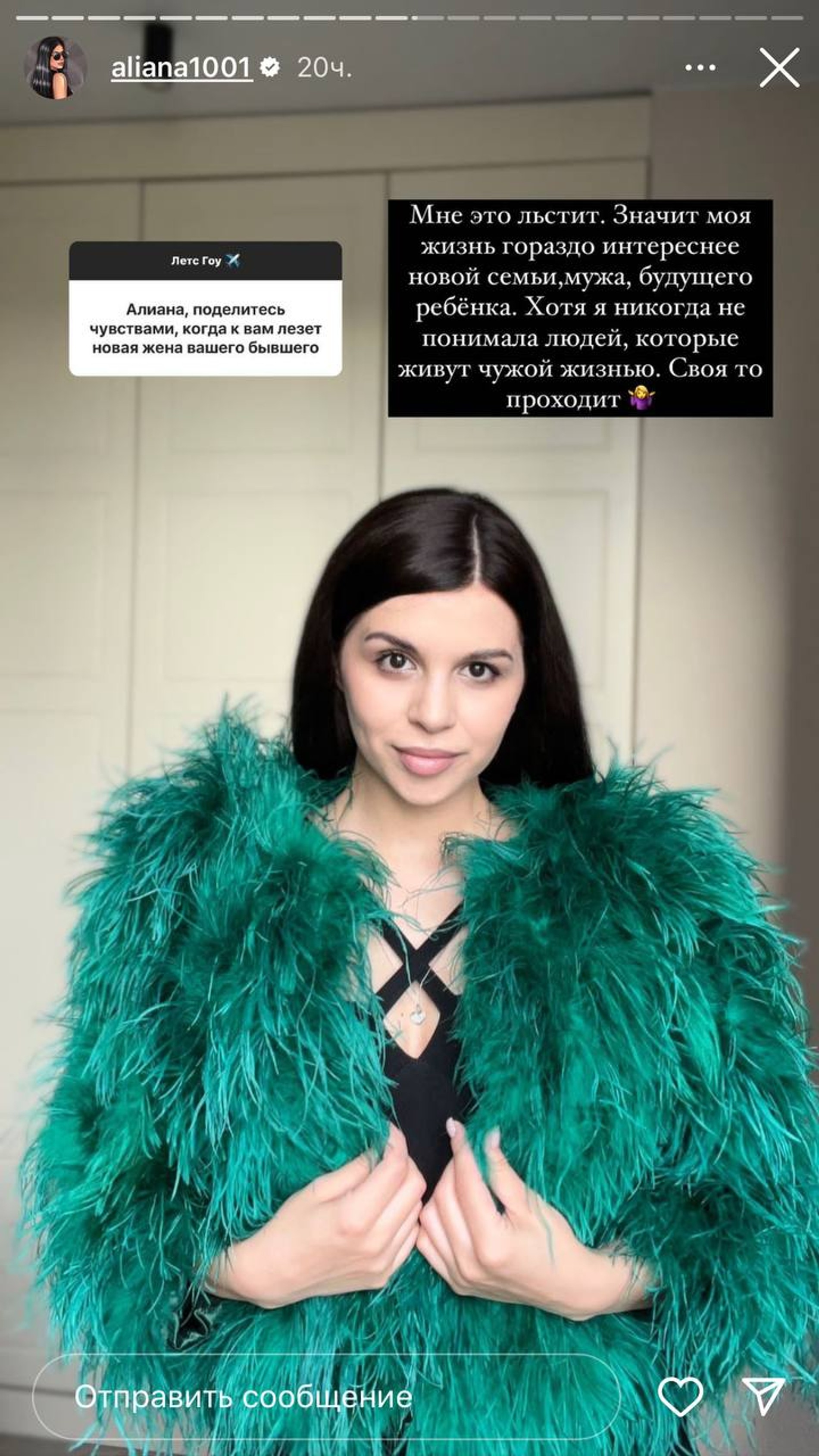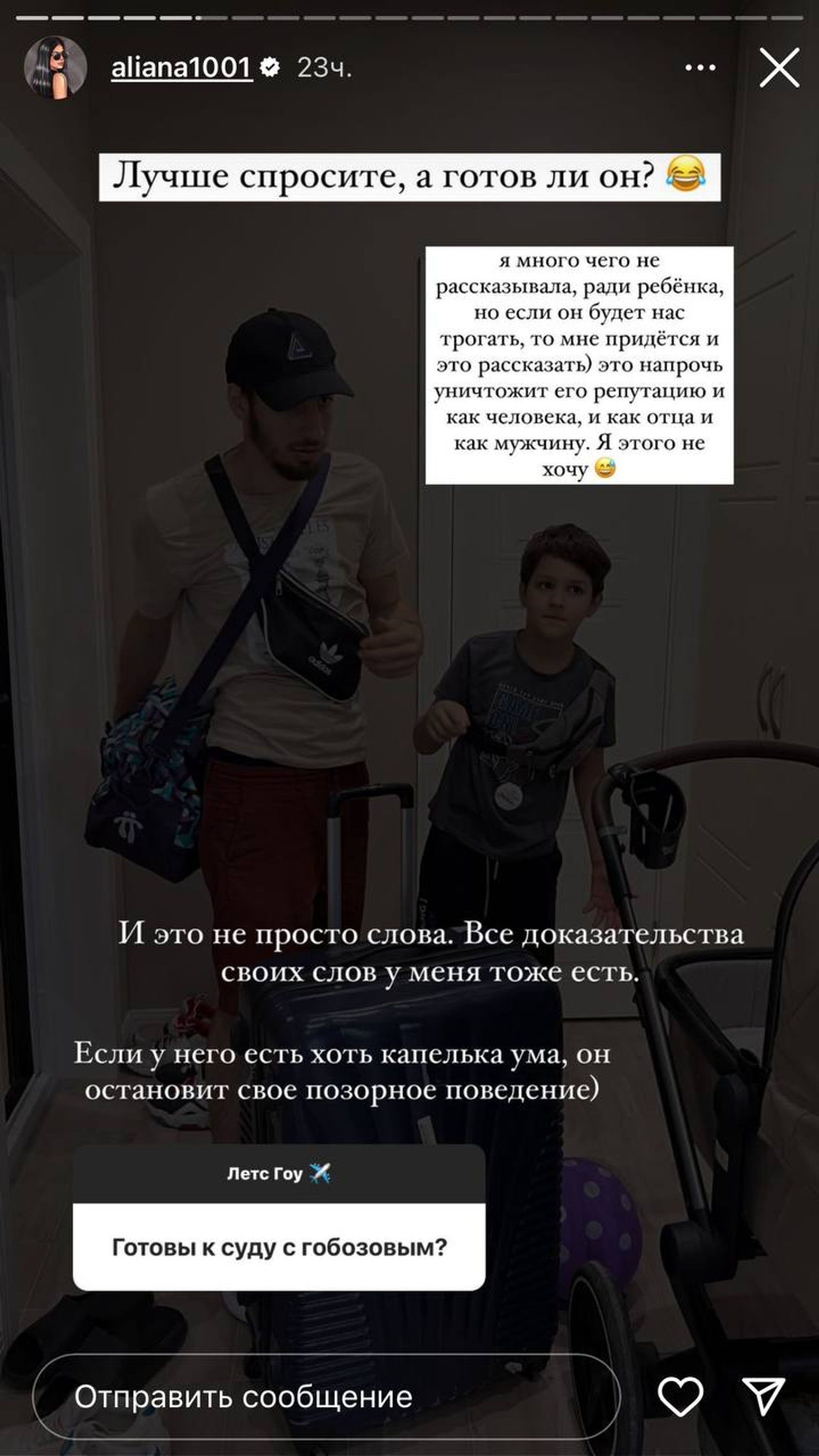На вопрос подписчика, готова ли Алиана к очередным выяснениям отношений с экс-супругом, она призналась, что ей уж точно бояться нечего. И в случае чего она выложит все, что долго и тщательно замалчивала ради их общего сына Роберта. «Это напрочь уничтожит его репутацию и как человека, и как отца, и как мужчины», — сурово высказалась девушка. И хотя сама она того бывшему мужу не желает, но говорит, если не прекратит «позорное» поведение, пощады ждать не стоит.