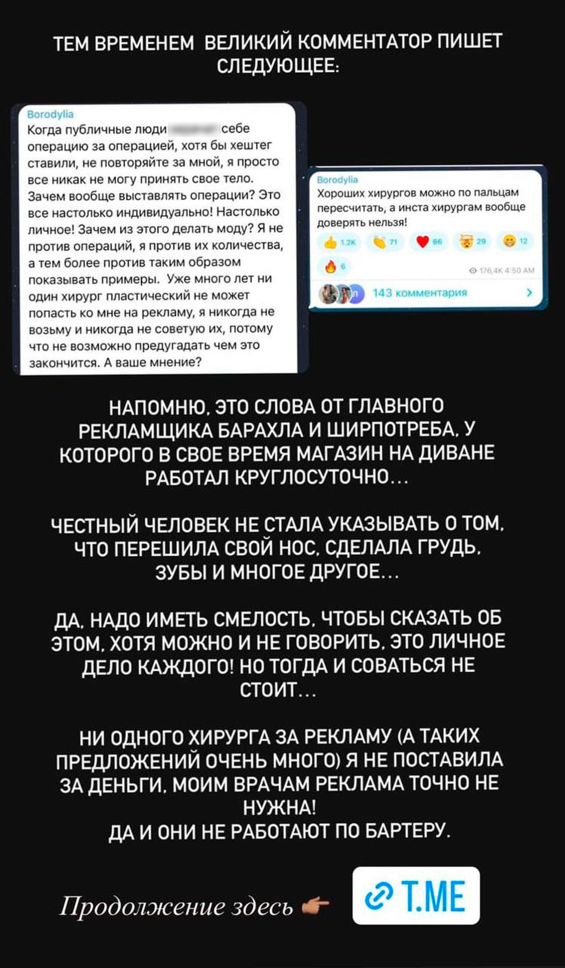 Никаких имен в тексте нет, однако догадаться, к кому он обращен, не так уж и трудно. Вот уже несколько недель чуть ли не главным селебрити-ньюсмейкером в запрещенной соцсети остается Виктория Боня, которая во всех подробностях рассказывает об операции у знаменитого лос-анджелесского врача и сложном процессе восстановления. Собственно, ждать ответа от последней долго не пришлось. Модель не стала стесняться в выражениях и назвала Бородину «главным рекламщиком барахла и ширпотреба». А заодно перечислила все манипуляции с внешностью, к которым якобы прибегла в свое время сама Ксения.