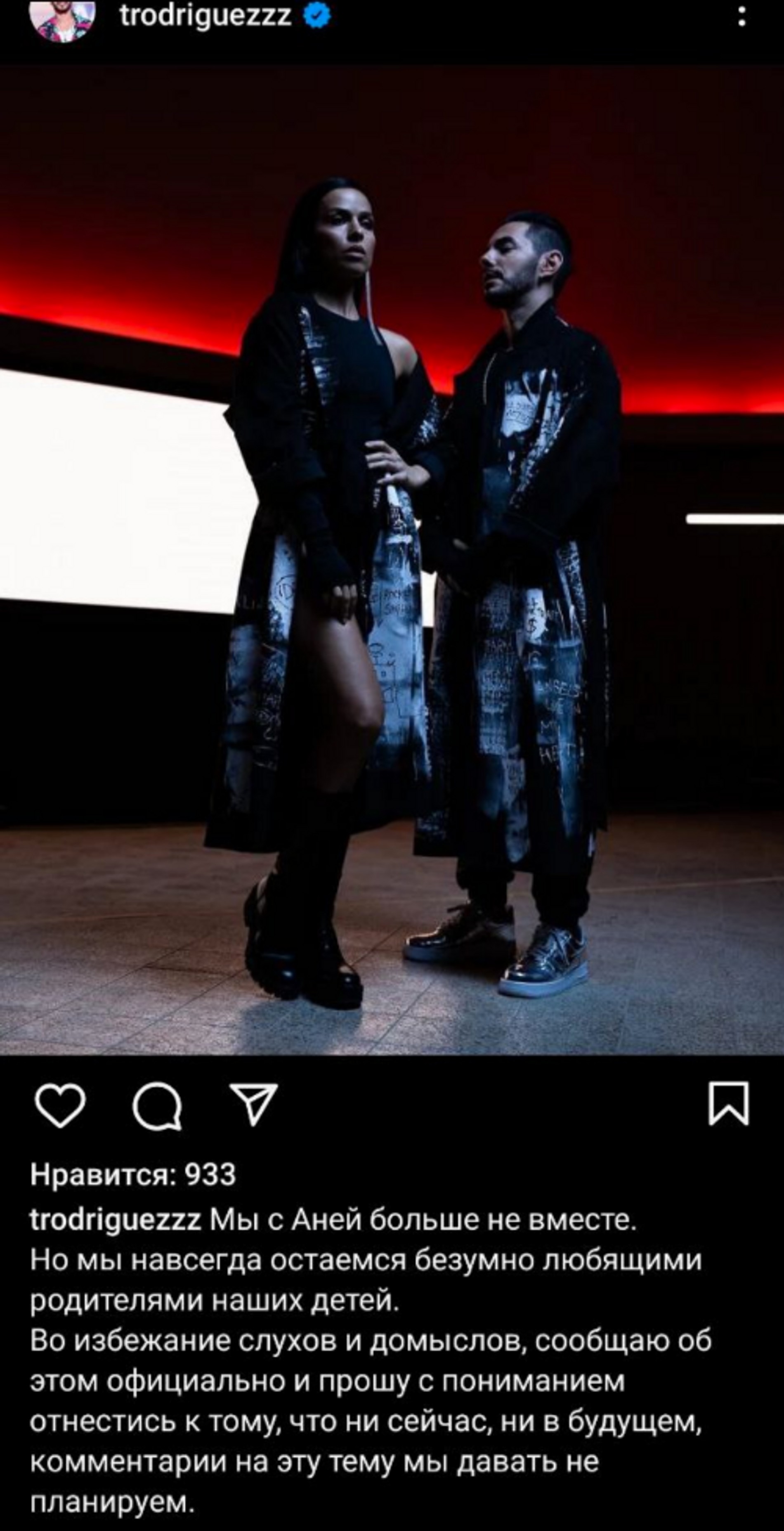«Мы с Аней больше не вместе. Но мы навсегда остаемся безумно любящими родителями наших детей. Во избежание слухов и домыслов сообщаю об этом официально и прошу с пониманием отнестись к тому, что ни сейчас, ни в будущем комментарии на эту тему мы давать не планируем»