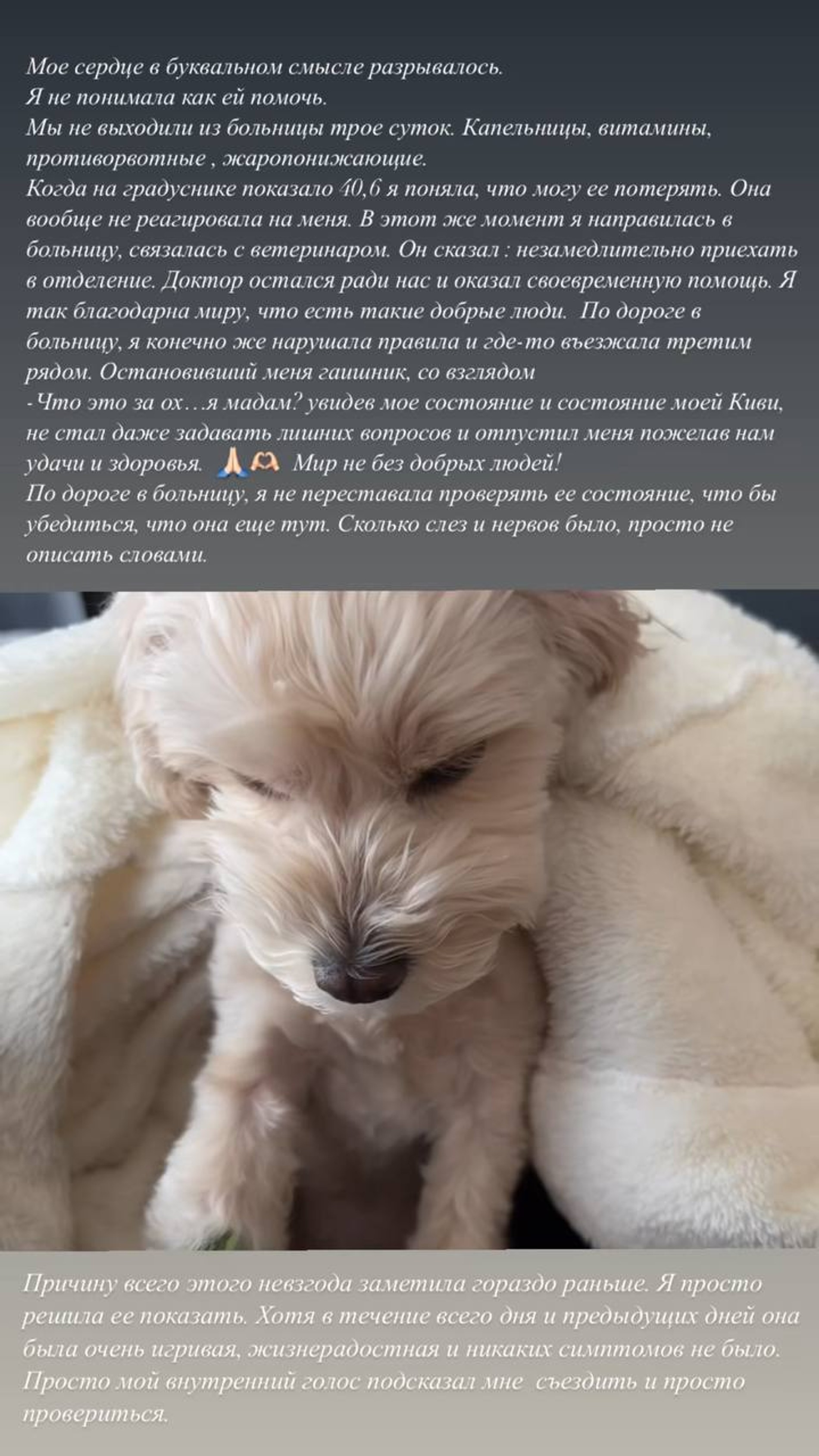 Оказывается, продолжительное время Иванова занималась своим питомцем — трое суток блогер и ее собака провели в больнице, где Вале каждые два часа приходилось просыпаться по будильнику и отслеживать температуру животного. Любимец инстадивы в какой-то момент даже перестал реагировать на хозяйку и едва не сгорел от жара, диагноз — бронхит. «Мое сердце в буквальном смысле разрывалось. Я не знала, как ей помочь... Сколько слез и нервов было, просто не описать словами», — пожаловалась Иванова в Инстаграме*.