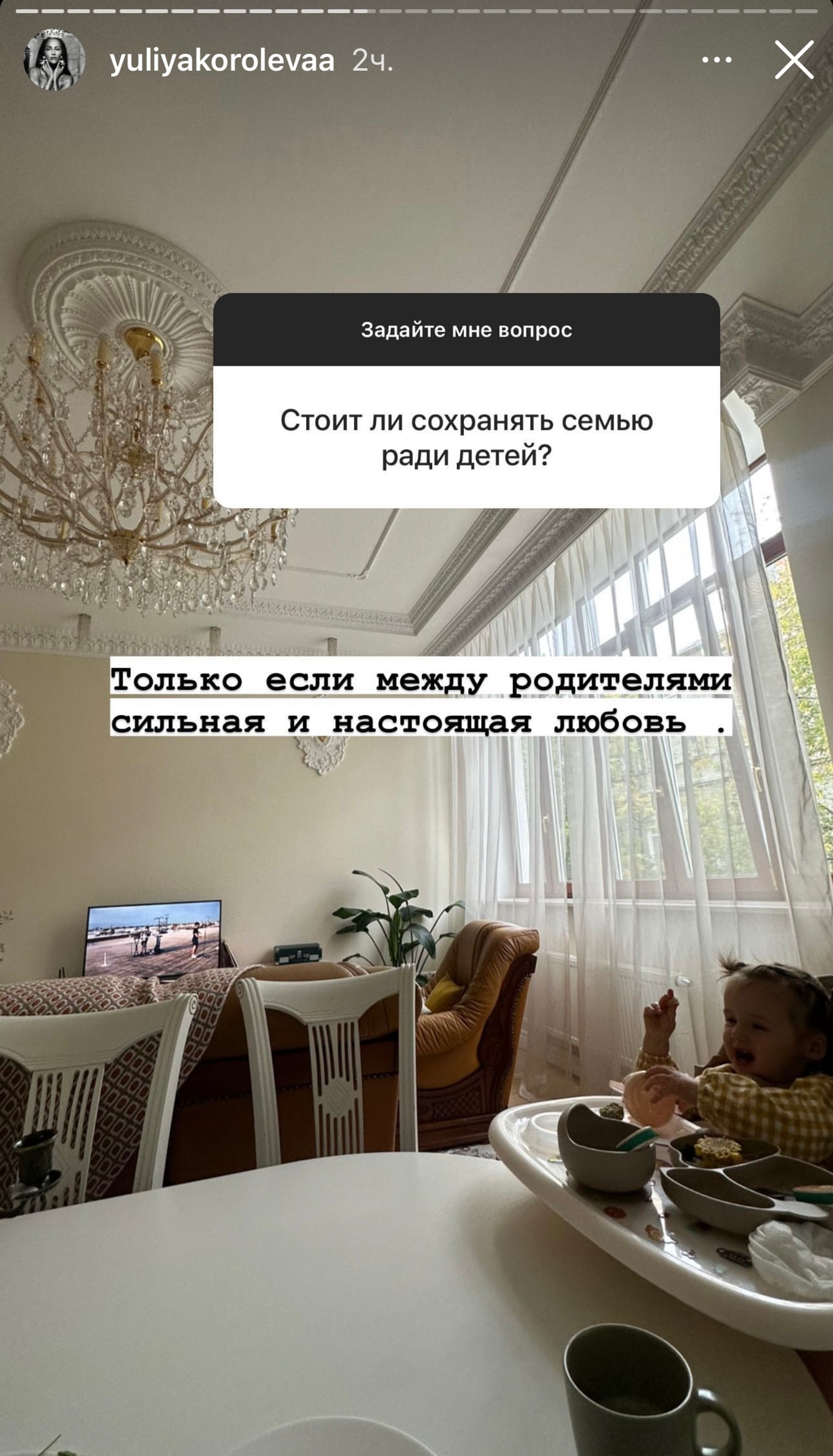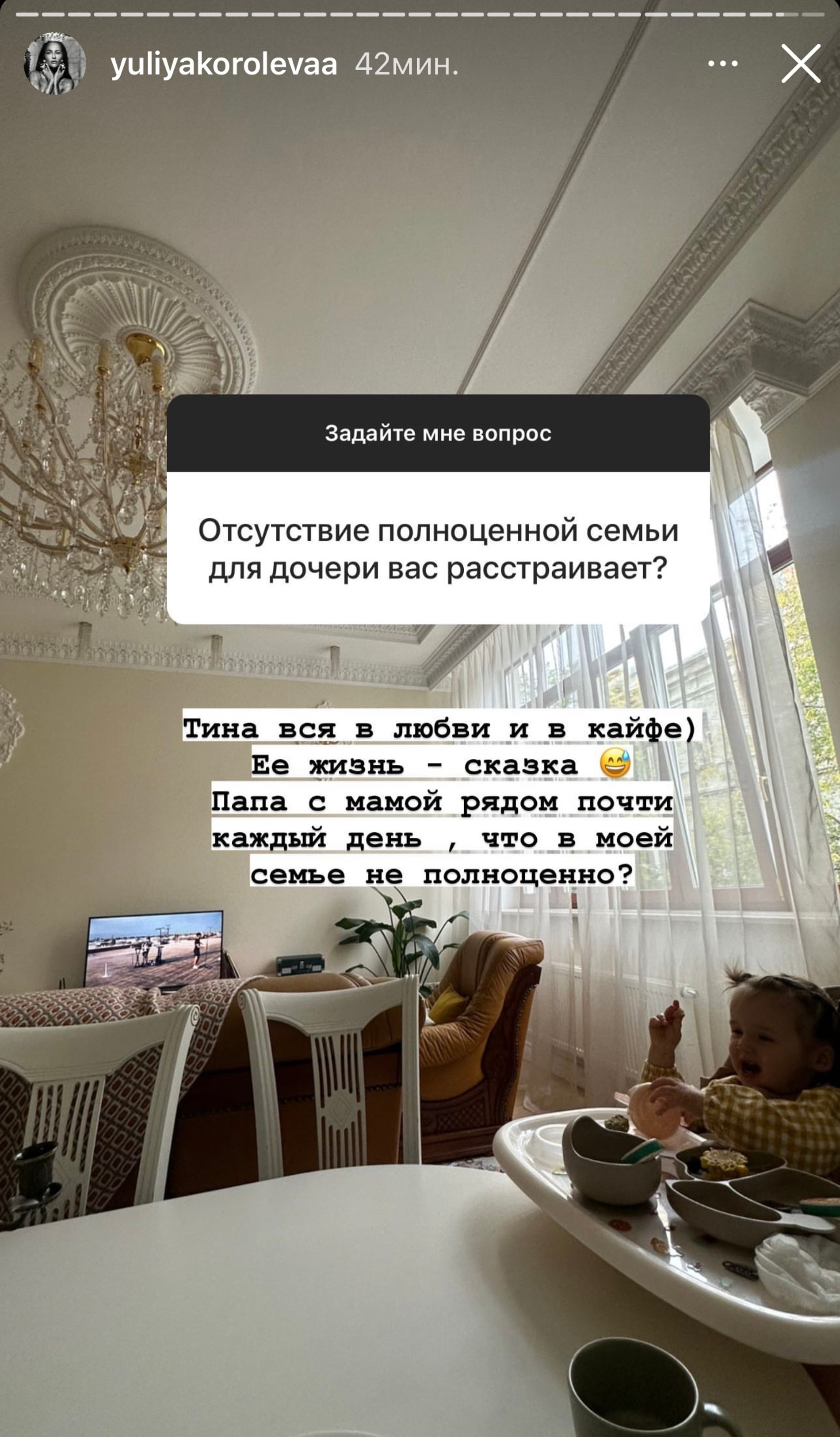 Давненько Юлия Королева не поднимала в своем блоге тему семьи и материнства. Сегодня супруга Гуфа разоткровенничалась в сторис, а в рубрике «Вопрос-ответ» поделилась с подписчиками своими мыслями по поводу воспитания дочери. Поклонники семьи Долматова не стали тянуть и сразу спросили Юлию о том, не беспокоит ли ее тот факт, что Тина растет «в неполноценной семье»?