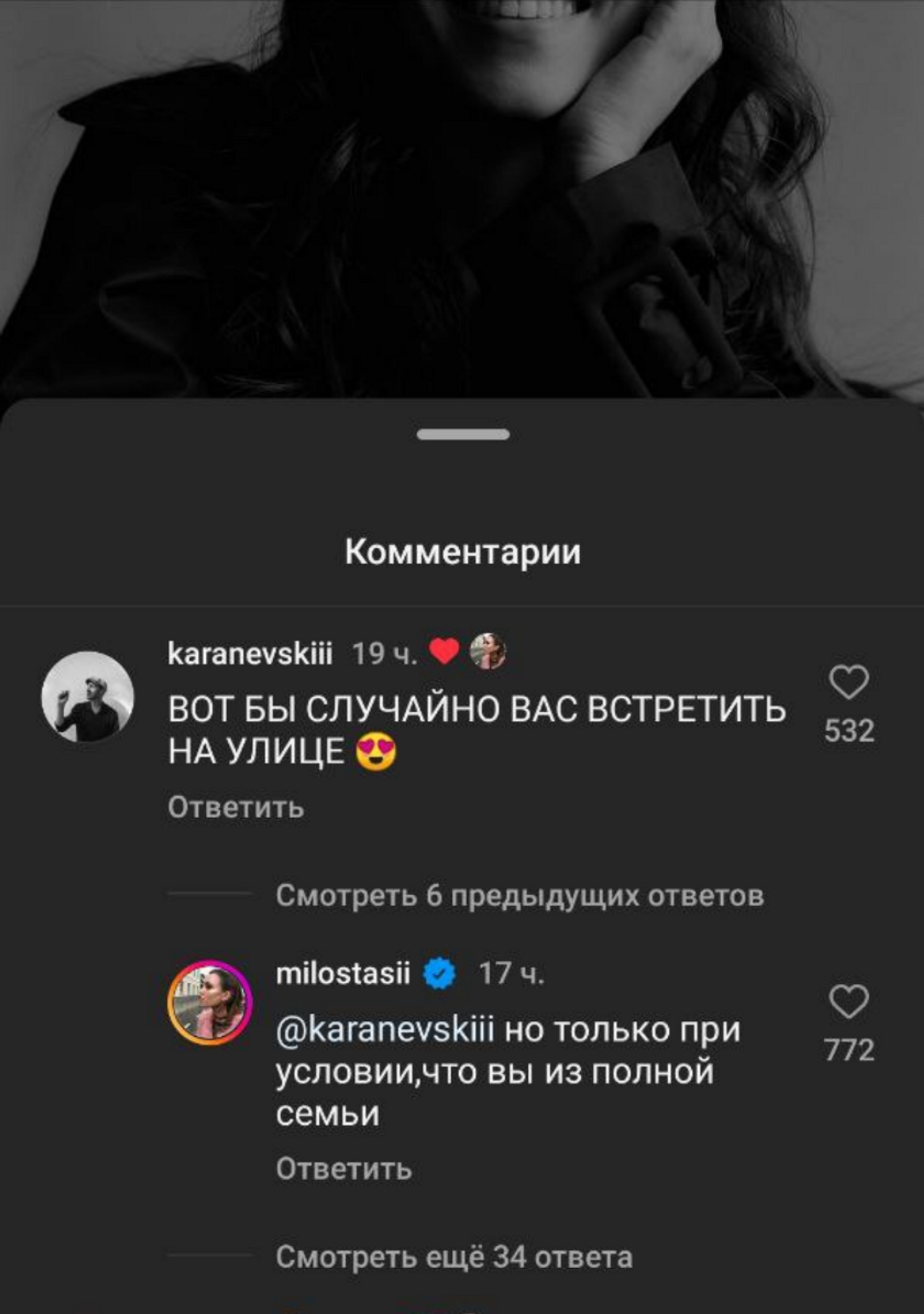 Накануне Стася опубликовала в Инстаграме* свою свежую черно-белую фотографию. Никак, к слову, ее не подписав. Все самое интересное произошло в комментариях. «Вот бы случайно вас встретить на улице», — написал под снимком актер фильма «Дылды» Дмитрий Караневский. «Но только при условии, что вы из полной семьи», — ответила ему Стася. Подписчики посчитали, что таким образом Милославская подколола бывшего.