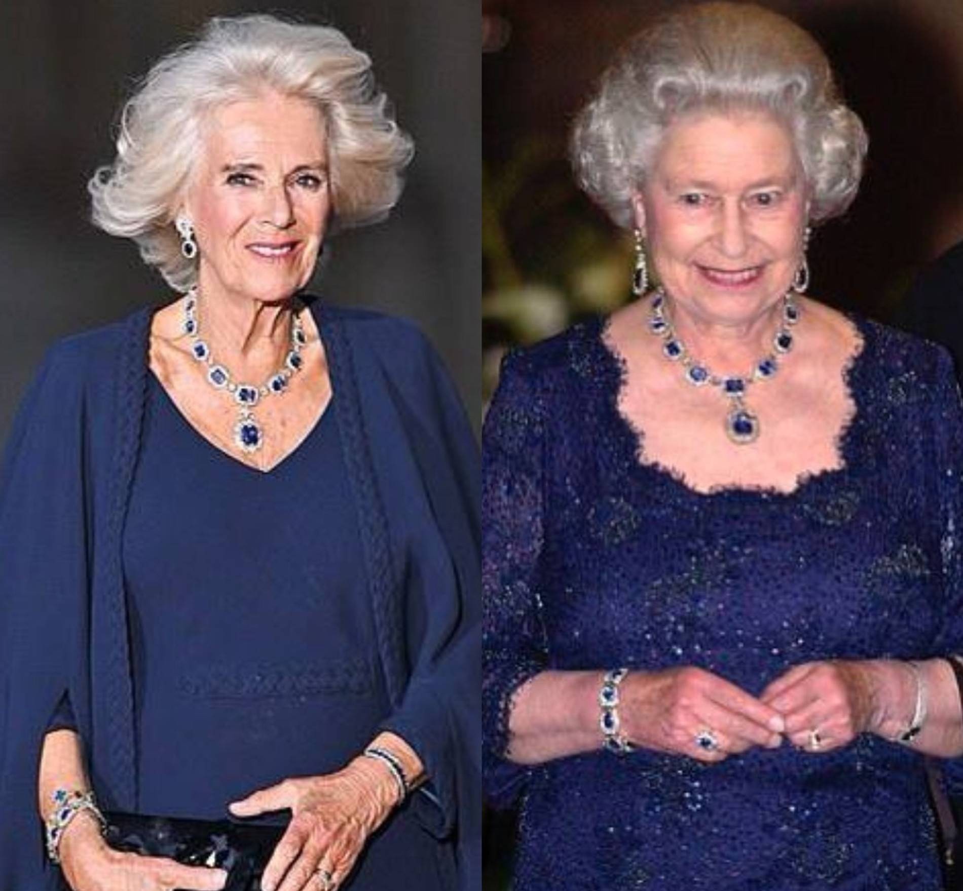 Вкупе с бриллиантовым колье и серьгами с сапфирами наряд Камиллы был крайне похож на один из выходов в свет самой Елизаветы II. Ну вы только взгляните!
