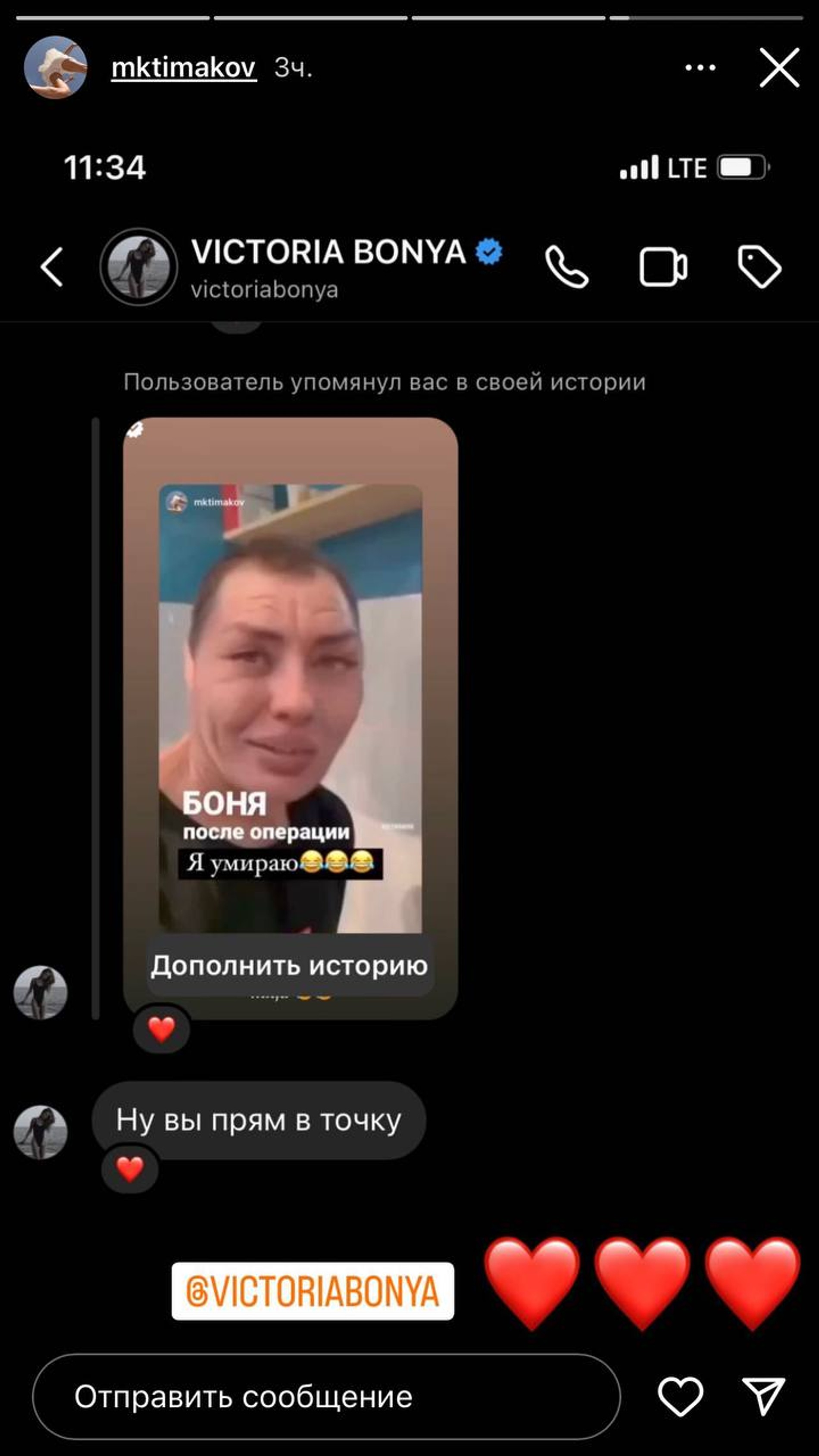 К удивлению подписчиков, уже которую неделю наблюдающих за тем, как набирают скорость эмоциональные качели Виктории, телеведущая на шутку отреагировала положительно. Она не только репостнула видео, но и добавила собственный комментарий. «Так нечестно. Я не давала разрешения на публикацию моего лица», — написала Боня у себя в сторис. А самого создателя даже порадовала сообщением в директ: «Прям в точку».
