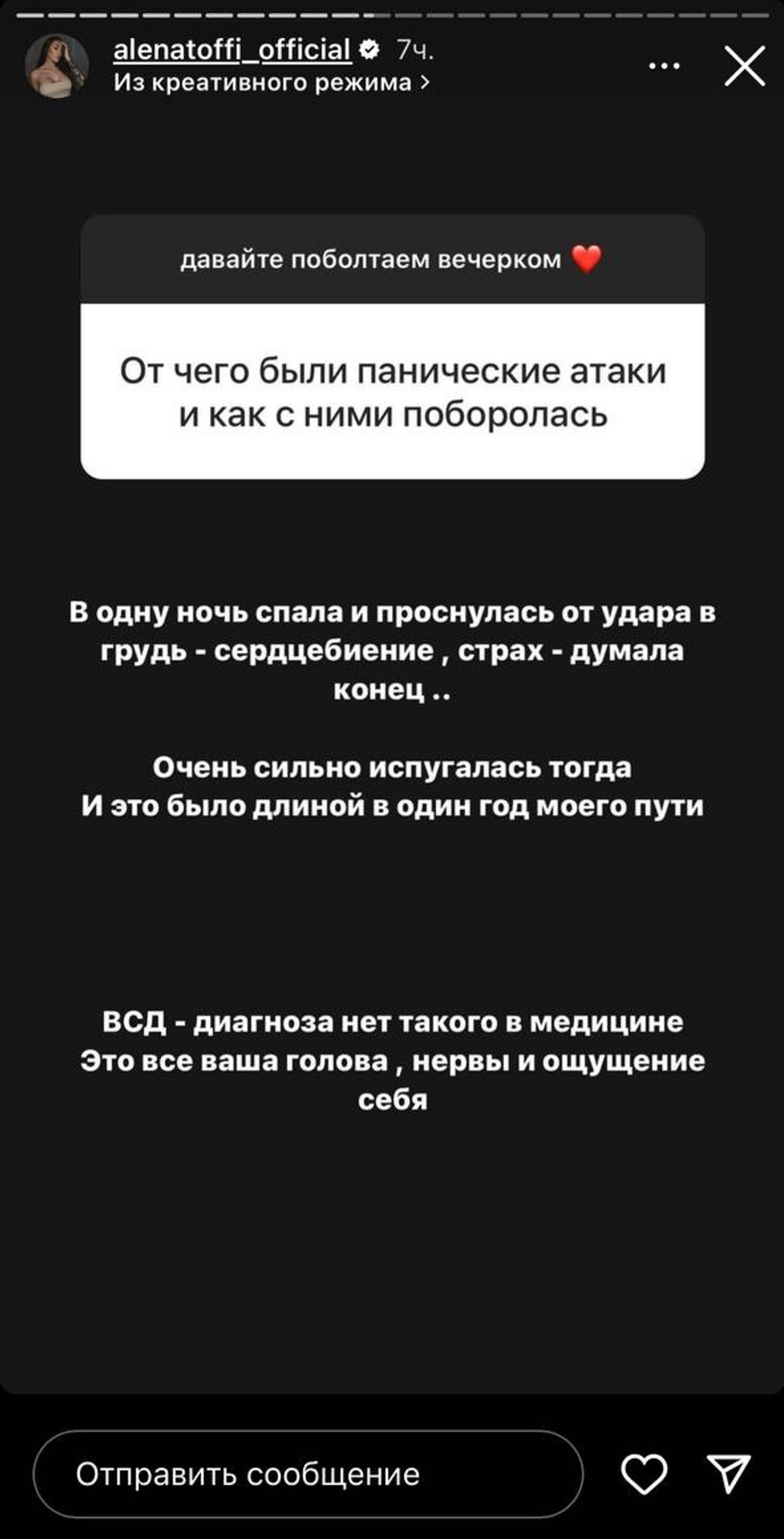 По собственному признанию, экс-участница телестройки научилась контролировать панические атаки и теперь придает им гораздо меньшее значение, чем прежде. «Давно поняла, что это мои нервы. Нужно просто избавиться от стресса и усталости... В одну ночь спала и проснулась от удара в грудь — сердцебиение, страх, думала, конец», — поделилась Алена. Она подчеркнула, что уже давно осознала: все проблемы ее были в голове. Однако на фоне затянувшегося развода неудивительно, что поклонники беспокоятся: панические атаки вкупе с повышенной тревожностью могут вернуться вновь. Впрочем, у Алены, кажется, все в полном порядке, а серьезные проблемы позади.