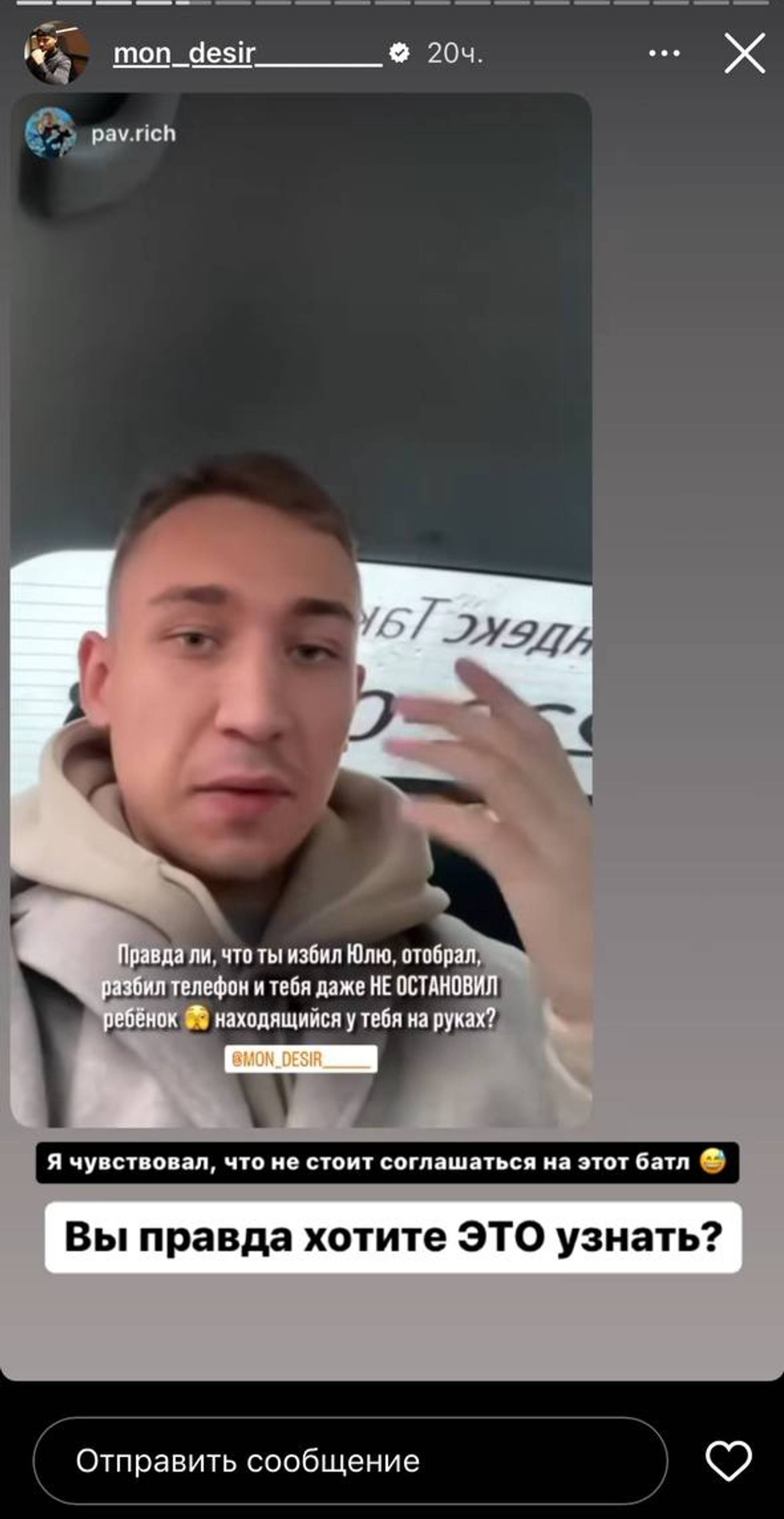«В какой-то момент я услышал бесперебойные уведомления, приходящие Юле на телефон, и решил посмотреть. Я взял телефон и просто офигел. Я понял, что Юля выложила наш с ней личный разговор, просто заранее все это спланировала, смонтировала и предательски, исподтишка сделала это все... Я задаю ей вопрос: "Зачем ты это сделала? Для чего ты это сделала в мой день рождения?" Человек вообще не реагировал... Я вспылил, выхватил телефон из рук и швырнул его на пол... В какой-то момент Юля сама бросилась на меня, и мне пришлось ее от себя оттаскивать»