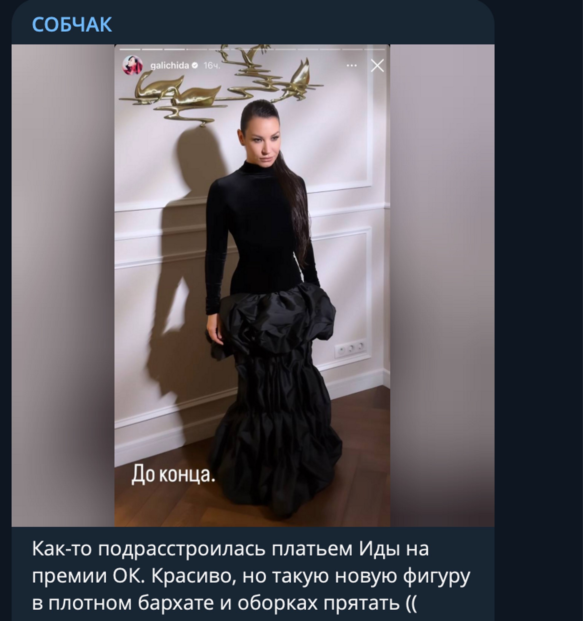 «Как-то подрасстроилась платьем Иды на премии ОК. Красиво, но такую новую фигуру в плотном бархате и оборках прятать...» — написала Ксения Собчак в своем Telegram-канале. В общем, вроде бы и критика, но на самом деле щедрый комплимент.