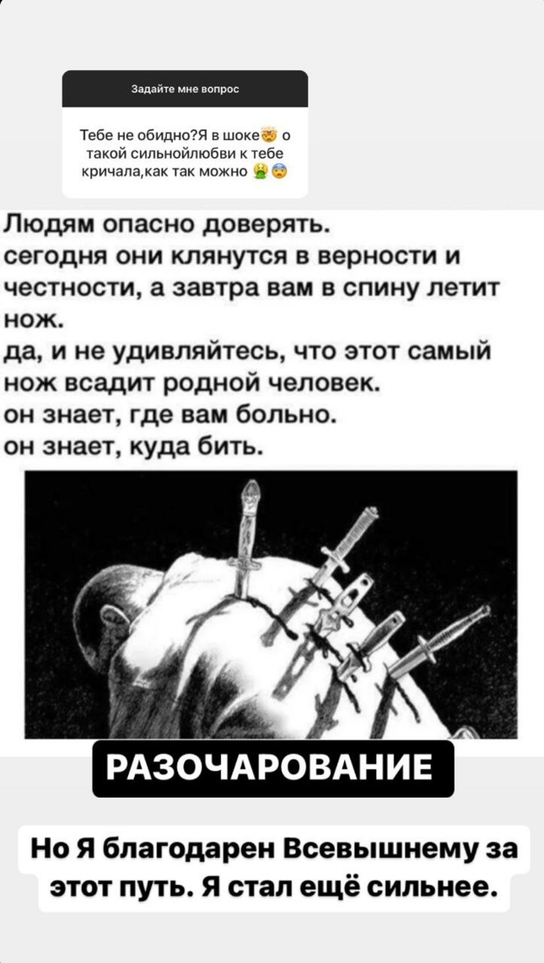Кто-то из подписчиков и вовсе пошел на провокацию: задал вопрос, как Мондезир относится к тому, что Юлия якобы живет с бывшим заключенным. Экс-участник «Дома-2» заявил, что любит малышей и если с ними что-то произойдет, то «сровняет все с землей». Также он сказал несколько слов об отношениях с Ефременковой и намекнул на болезненное расставание с ней. «Людям опасно доверять. Сегодня они клянутся в верности и честности, а завтра в спину вам летит нож», — написал мужчина. А заодно заверил подписчиков, что личная жизнь экс-супруги ему больше не интересна. «Я желаю ей только счастья и надеюсь, это именно то счастье, которое она искала», — добавил он.