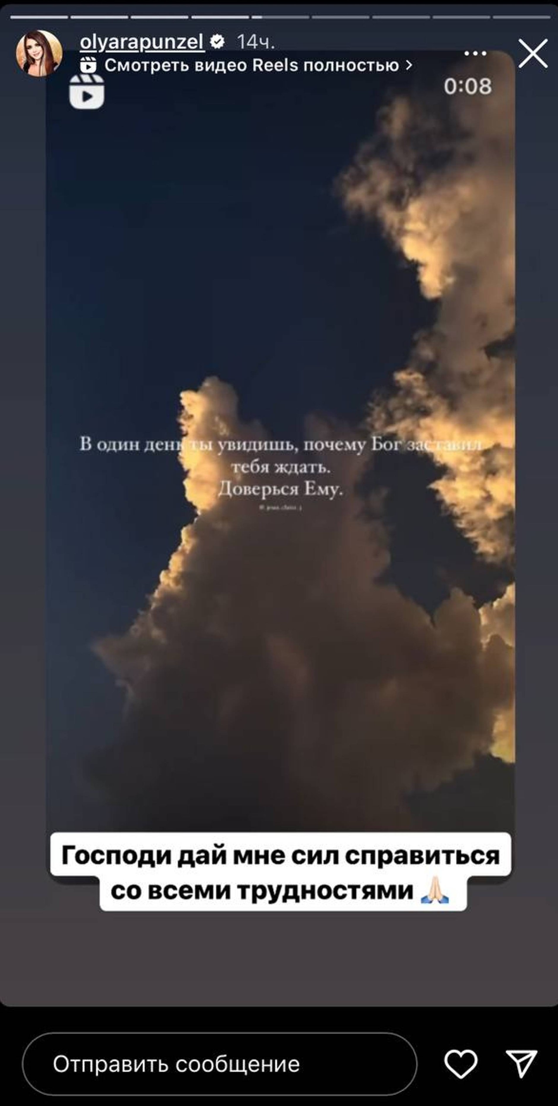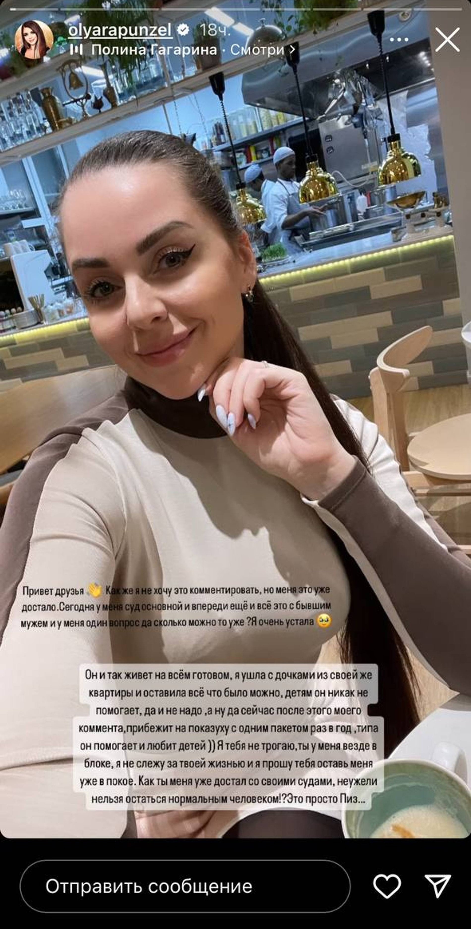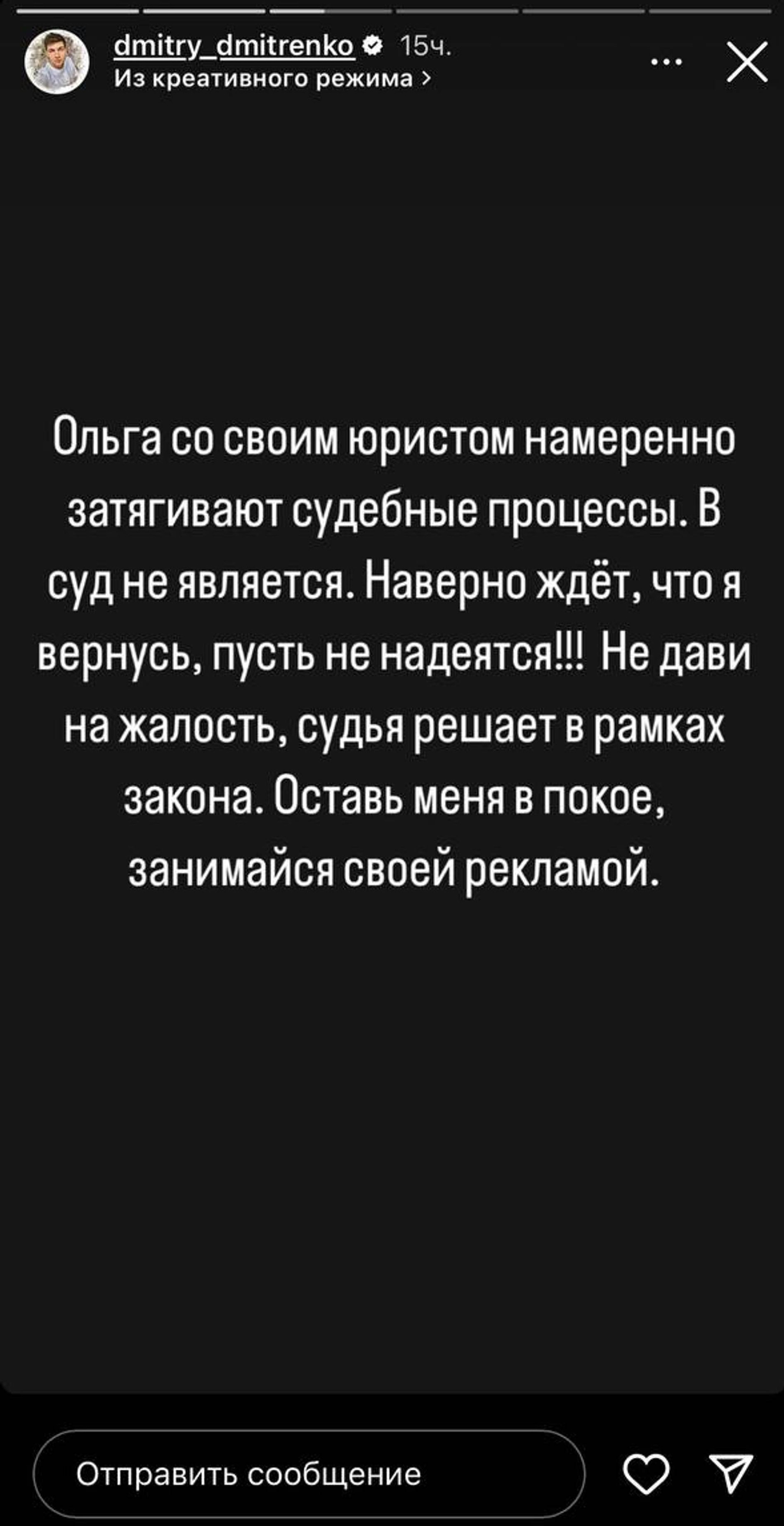 Тот в свою очередь бывшей жене ответил и в очередной раз подчеркнул, что кого нужно оставить в покое, так это его, а еще добавил, что девушка намеренно затягивает судебные процессы. «Не дави на жалость, судья решает в рамках закона. Оставь меня в покое, занимайся своей рекламой», — написал он в запрещенной соцсети. Оля же вслед за ним опубликовала сторис, в которой понадеялась, что ей хватит сил пережить все трудности.