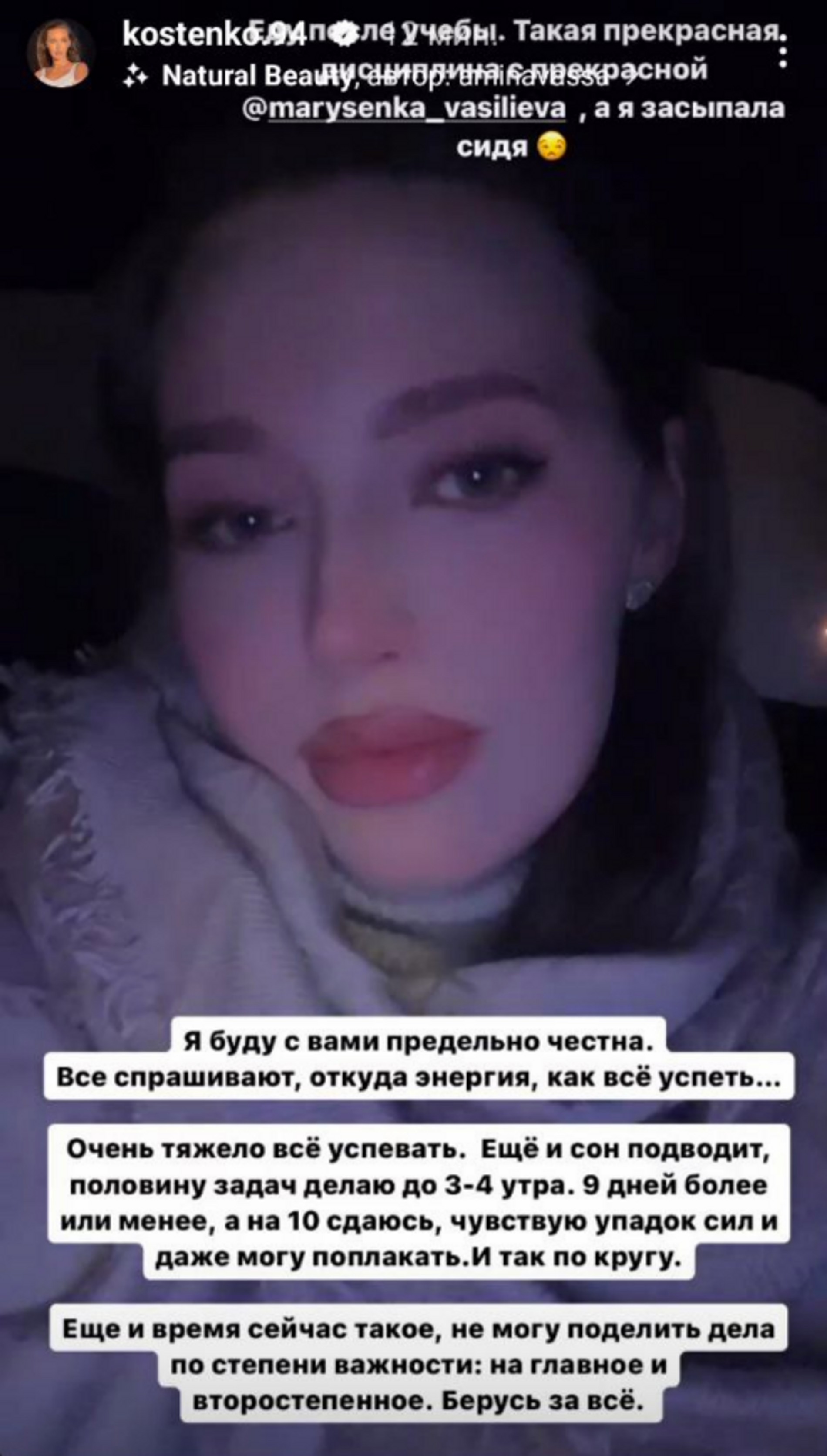 «Я буду с вами предельно честна... Очень тяжело все успевать. Еще и сон подводит, половину задач делаю до 3–4 утра. Девять дней более-менее, а на десятый сдаюсь, чувствую упадок сил и даже могу поплакать. И так по кругу. Еще и время сейчас такое, не могу поделить дела по степени важности: на главное и второстепенное. Берусь за все... Выговорилась, завтра 100% будет легче», — написала модель в сторис.