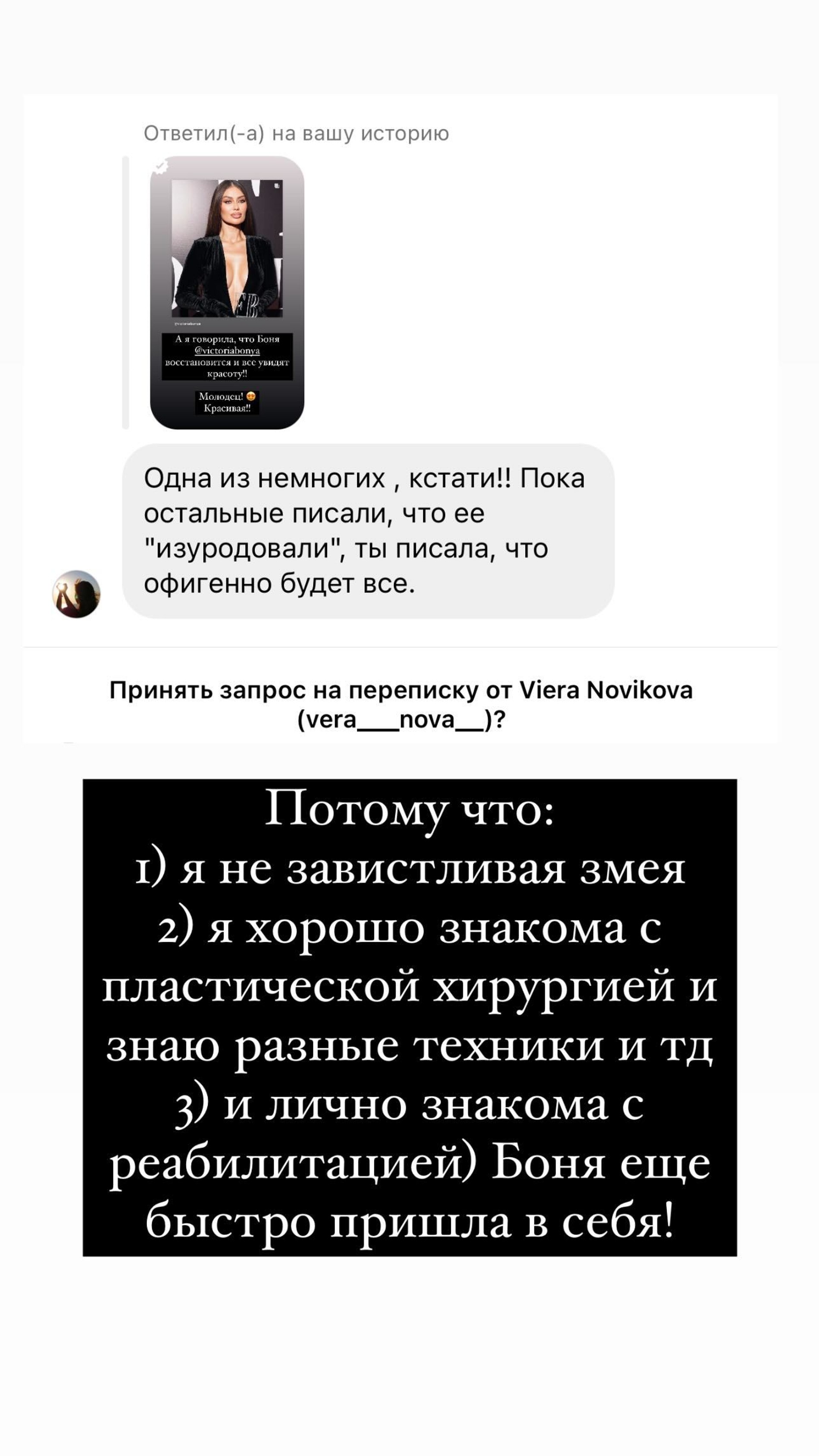 Преображение ведущей Виктории Бони, которая наконец перестала скрывать лицо после пластической операции, стало причиной бурных обсуждений. Так, заклятая подруга инста-дивы Ксения Бородина уже успела подколоть бывшую коллегу по «Дому-2», получить резкий ответ и помириться с ней спустя всего пару дней. А теперь своим мнением поделилась и бывшая жена Гуфа.