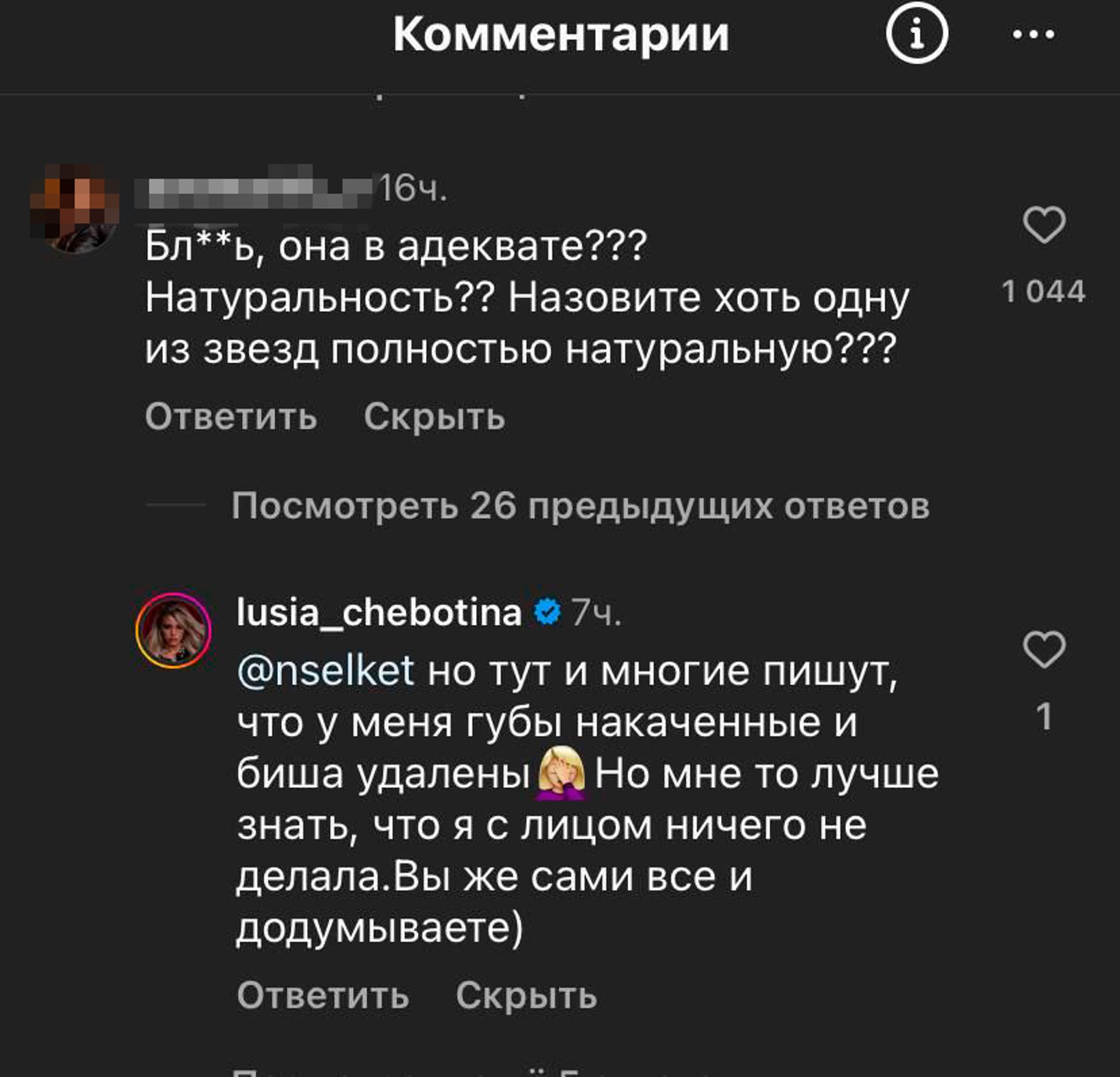 Видео с высказываниями Чеботиной о естественной красоте появилось в Инстаграме* Super, там же подписчики, послушав артистку, принялись обвинять ее в лукавстве, аргументируя все тем, что и сама Люся не раз прибегала к бьюти-процедурам. Чего стоят хотя бы ее неестественно белые зубы и припухлые губы, заявили они. Певица поспешила ответить критиканам.