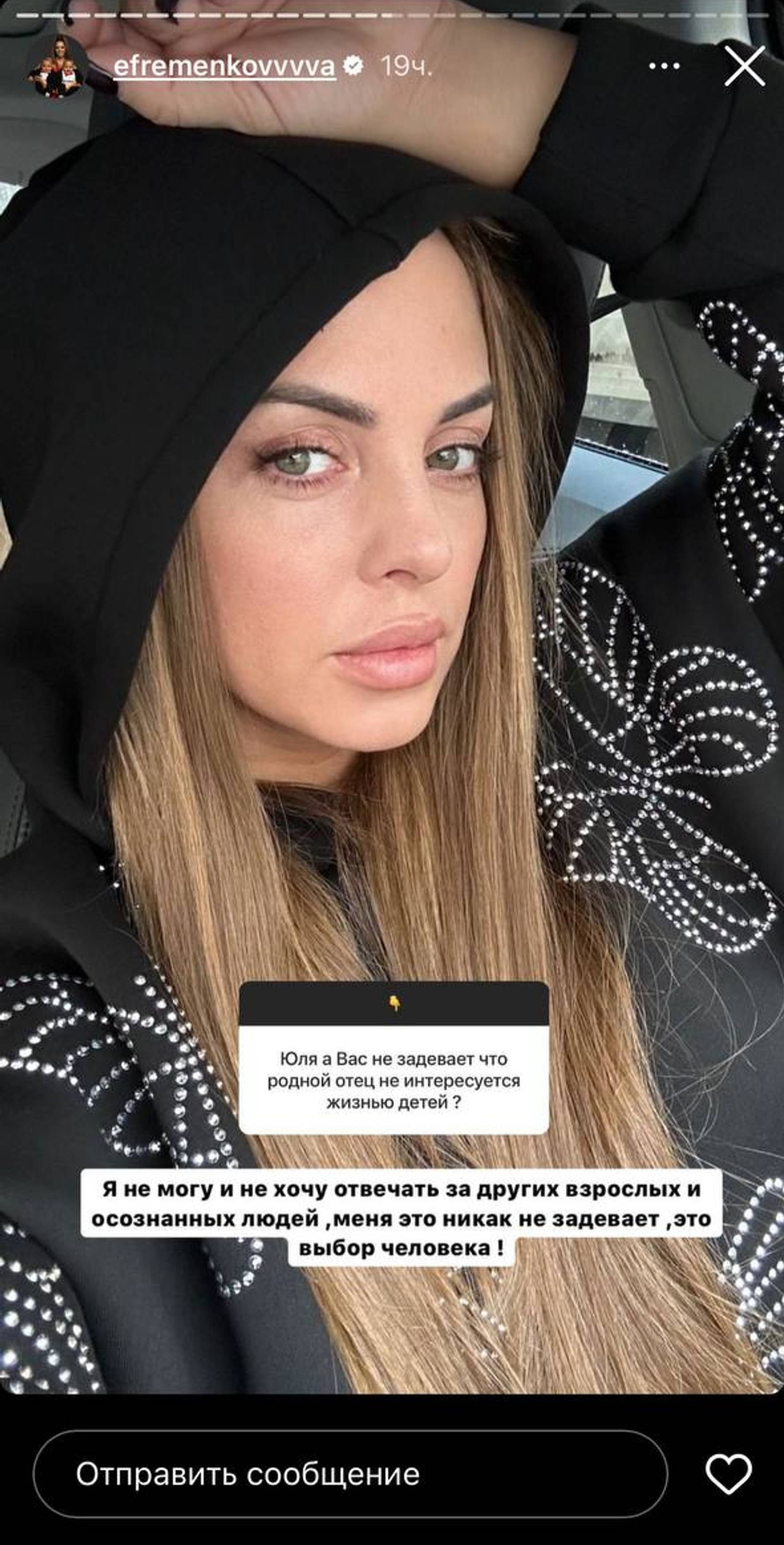 «Дети живут со мной, детьми полностью занимаюсь я, он в жизни детей не принимает никакого участия!» — эмоционально высказалась она в инстаграме* и показала скриншот из переписки с Мондезиром. Если верить Ефременковой, в последний раз экс-участник скандальной телестройки о самочувствии детей спрашивал месяц назад, тогда же и помогал им материально.