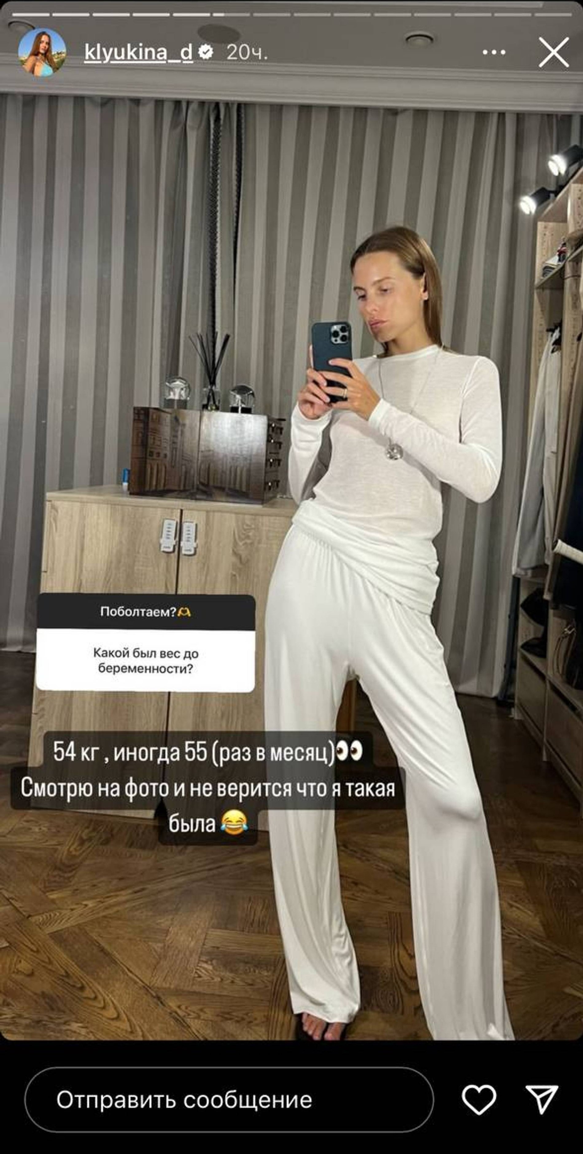 И хотя в свет Клюкина практически не выходит, ее блог, больше похожий на мудборд в Pinterest, пользуется у фанатов большой популярностью, и подписчицы нередко прибегают к Даше за советом или просто с любопытным вопросом. Накануне ее спросили, сколько весила девушка до беременности. Она призналась, что ее вес всегда колебался от 54 до 55 килограммов. «Смотрю на фото, и не верится, что я такая была», — написала Клюкина в Инстаграме*.