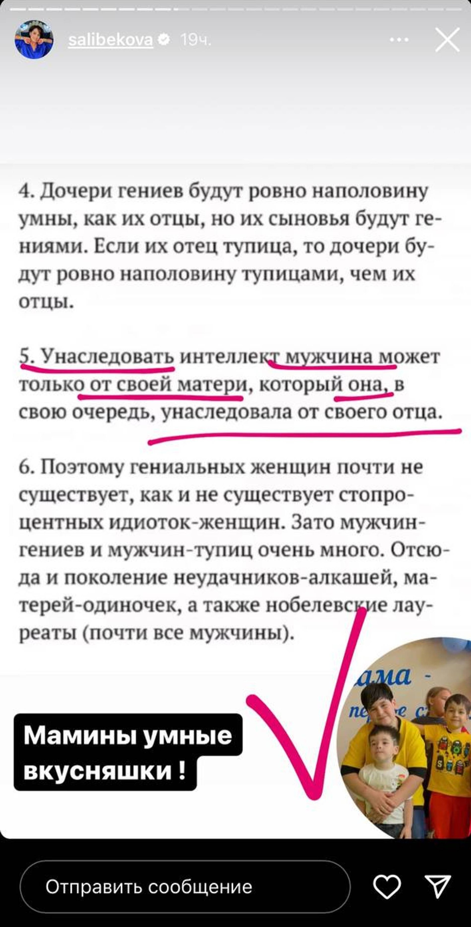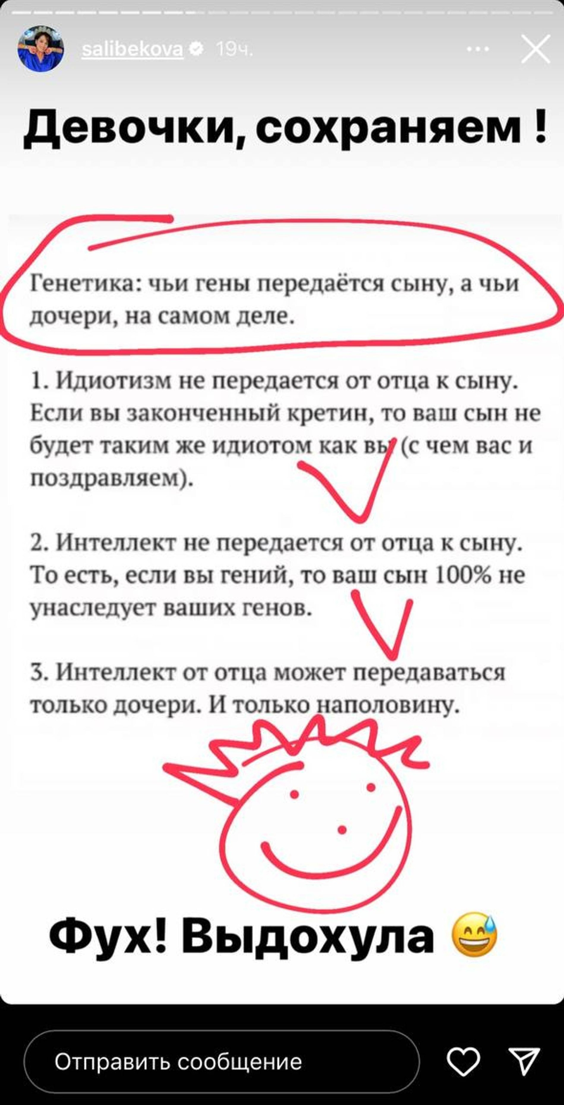 В Инстаграме* Юлия опубликовала несколько скриншотов из статьи, в которой говорится, какие черты дети унаследуют от родителей (напомним, у Салибековых трое сыновей), и на фразах об идиотизме поставила галочку. И, как бы убедившись, что самые плохие качества ее детям не достались, добавила: «Фух, выдохнула!» В чей огород был брошен камень, долго гадать не нужно.