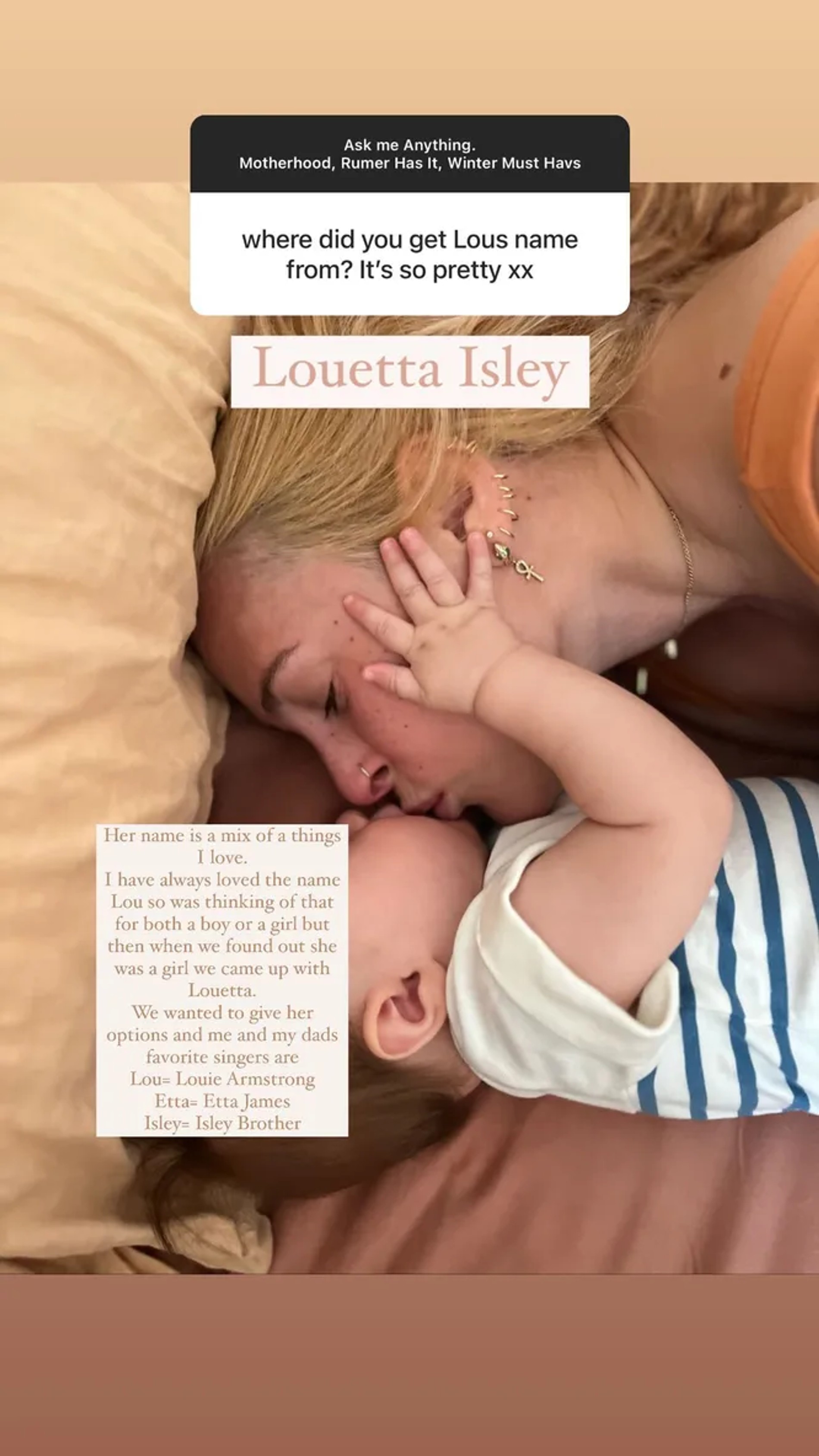 В своем инстаграме* девушка объяснила, что Луэтта — это комбинация из нескольких имен. Лу — универсальное, подошло бы как для мальчика, так и для девочки, а потому и стало основой. Позже, когда пол ребенка стал известен, решили совместить имена музыкантов, которые нравятся и Румер, и Брюсу. «Лу — Луи Армстронга, Этту — Этту Джеймс и Айсли — братьев Айсли», — объяснила дочь звезды.