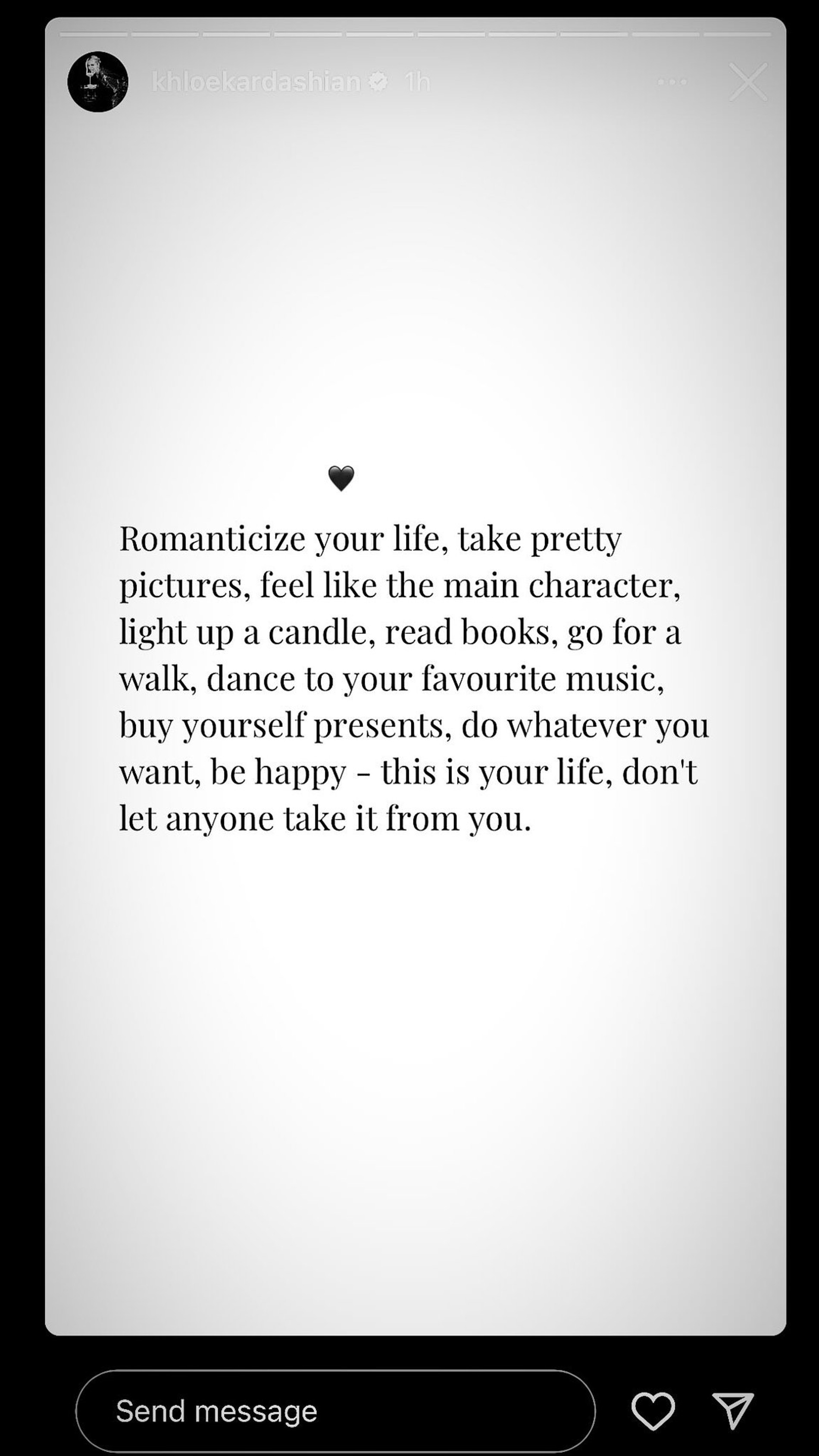 Также Кортни призвала своих подписчиц быть добрее к себе. «Романтизируйте свою жизнь, делайте красивые фотографии, почувствуйте себя главной героиней, зажгите свечу, читайте книги, гуляйте, танцуйте под любимую музыку, покупайте себе подарки, делайте все, что хотите, будьте счастливы — это ваша жизнь, не позволяйте никому отнять ее у вас», — написала она в сторис. Что ж, легко сказать и еще легче сделать, если ты мультимиллионерша со штатом прислуги. Но мы постараемся, обещаем!