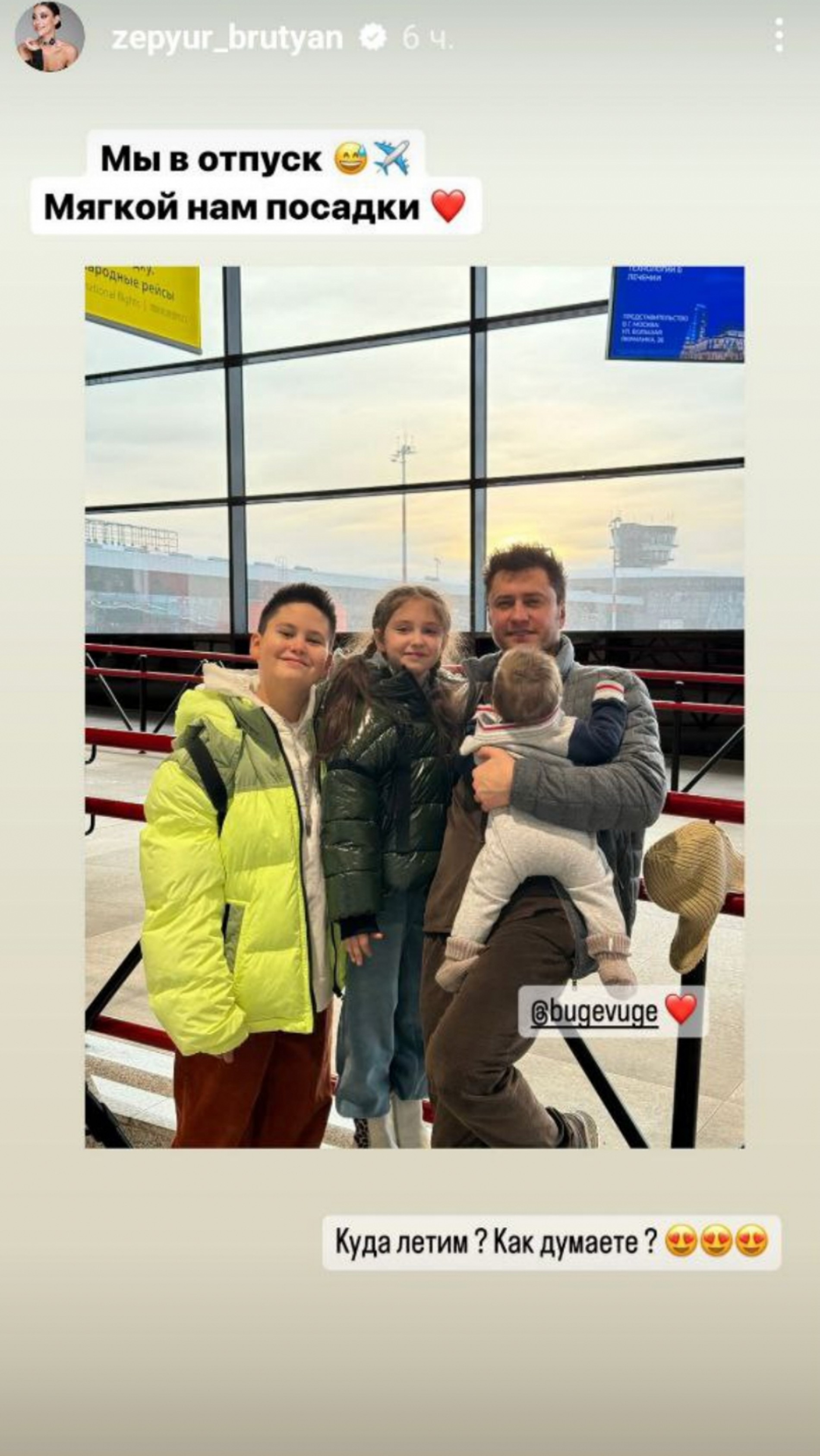 Фото, опубликованное Зепюр Брутян, свидетельствует, что в путешествие Прилучные предпочли полететь впятером: Павел и Зепюр с малышом Микаэлем, а также Мия и Тимофей. В таком составе они, к слову, в прошлом году отдыхали на Мальдивах. Куда семейство отправилось на этот раз, пока интрига. Пункт назначения ни Павел, ни его жена на данный момент не раскрыли, а попросили своих подписчиков высказать предположения.