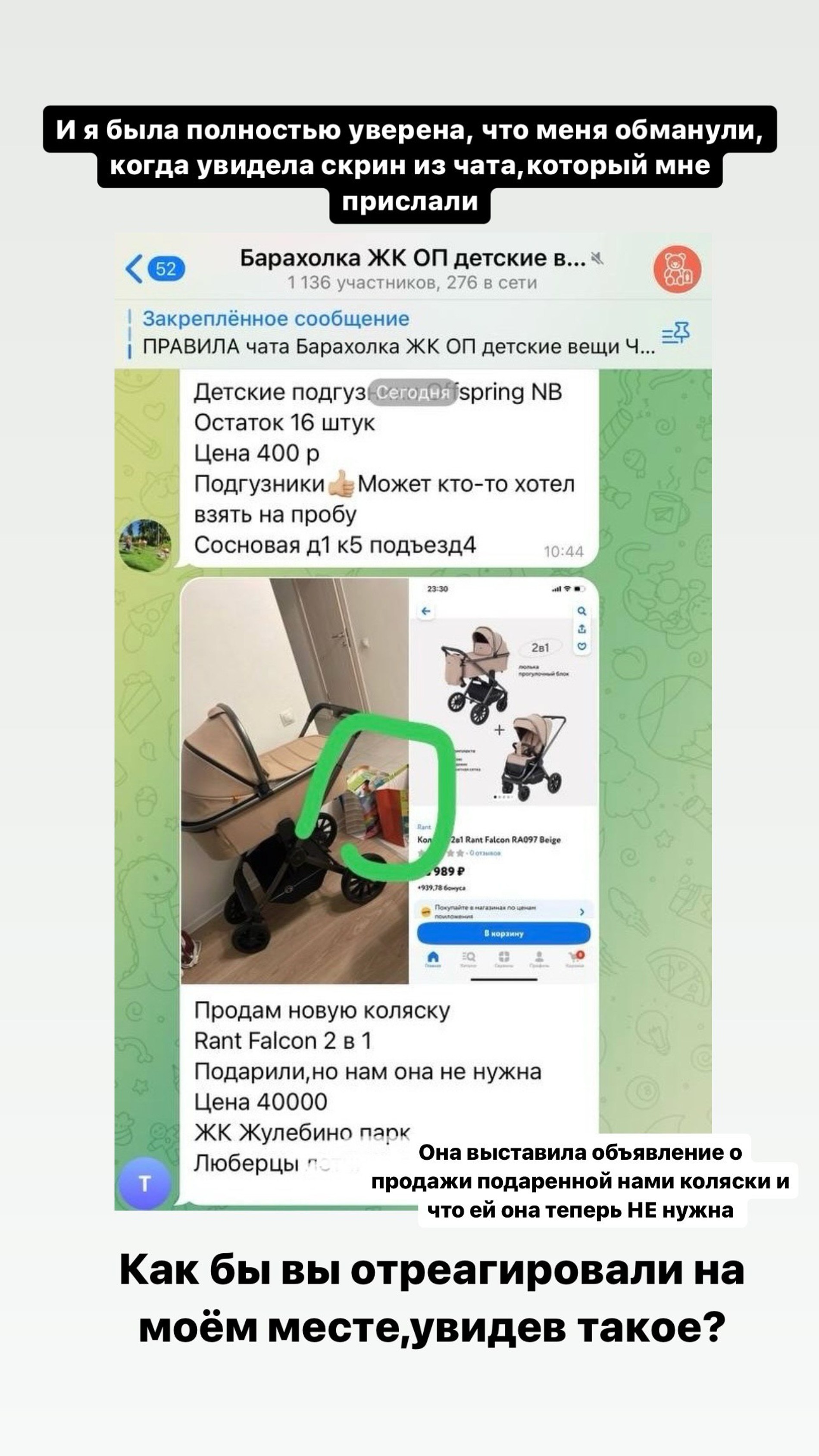 Но на следующий день от хорошего настроения экс-участницы реалити-шоу не остались ни следа. Оказалось, что ее главный презент — коляску — уже выставили на продажу за 40 тысяч рублей. Такое объявление появилось в чате дома, в котором проживает Тати.