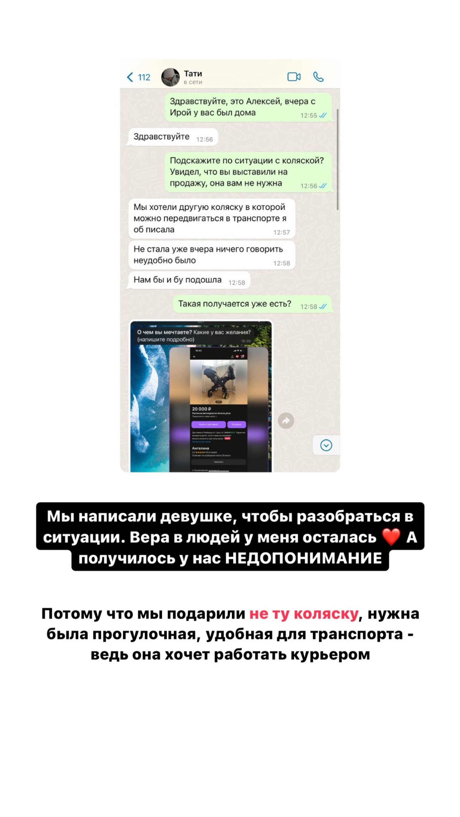 Помощники Пинчук тут же связались с женщиной. «Вера в людей у меня осталась. А получилось у нас недопонимание. Потому что мы подарили не ту коляску. Нужна была прогулочная, удобная для транспорта, ведь она хочет работать курьером», — объяснила звезда «Дома-2». Как ни крути, Ирина все равно совершила хороший поступок, и ее подписчица на деньги от продажи подарка сможет купить себе коляску, которая ей нужна.
