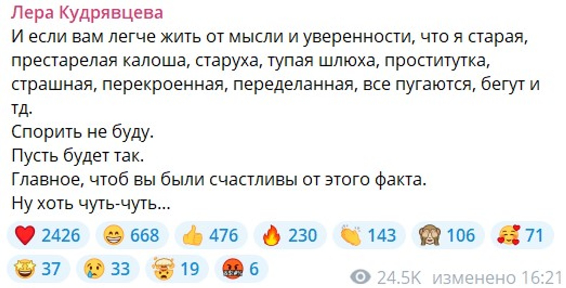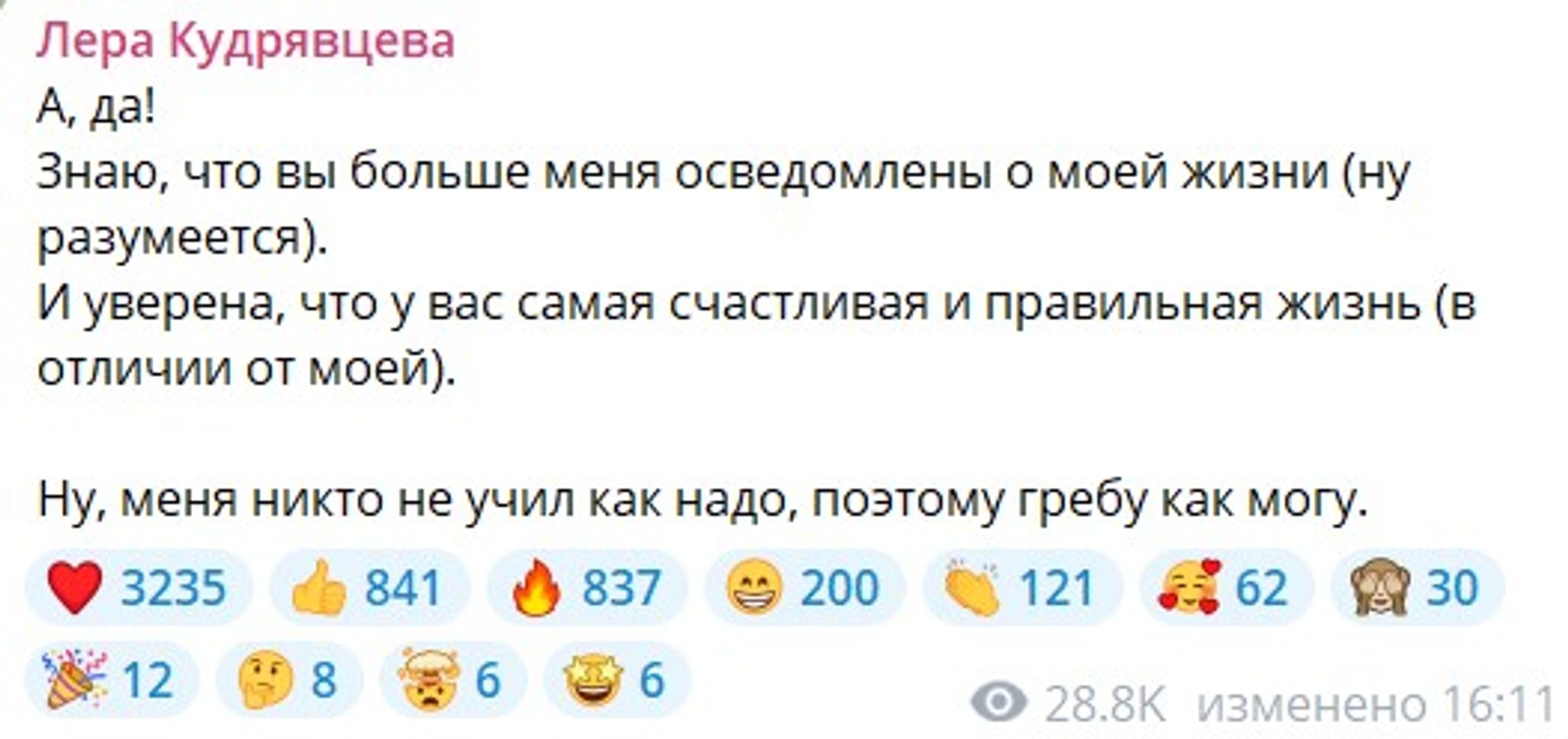 Судя по реакции Кудрявцевой, ее засыпали не только словами поддержки, но и оскорблениями. Ведущая шоу «Секрет на миллион» решила удовлетворить любопытство хейтеров и откровенно рассказала о себе в личном блоге. «Три брака. Люблю своих детей, семью, работу, друзей, умею дружить, любить, оберегать, помогать, готовить, стирать, убирать, отвечаю за свои слова. Есть кот Фофа. Курю. Не пью. Не жалуюсь. Внешность на любителя. Как мама родила <...> В целом обычная баба с публичной профессией», — написала она в своем телеграм-канале.