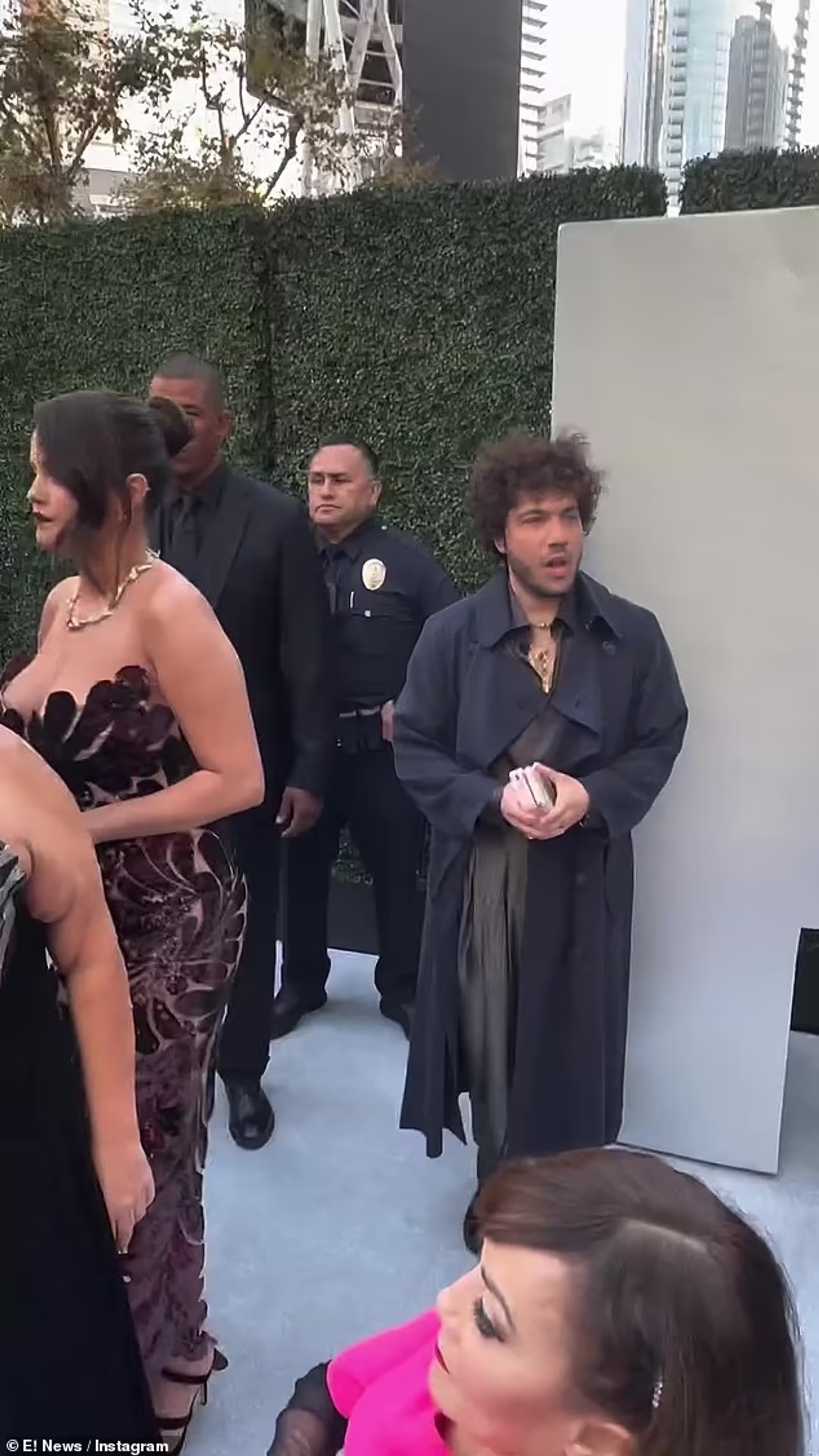 На ковровой дорожке Селена появилась в одиночестве, однако вне камер Бенни был все время рядом и поддерживал возлюбленную на важном для нее мероприятии (сериал «Убийства в одном здании» с Гомес в одной из главных ролей был номинирован в категории «Лучший комедийный сериал»). И пока Селена щеголяла на «сериальном «Оскаре» в роскошном прозрачном платье с пайетками от Oscar de la Renta, Бенни оделся в тренч, прикрывающий и без того странный костюм.