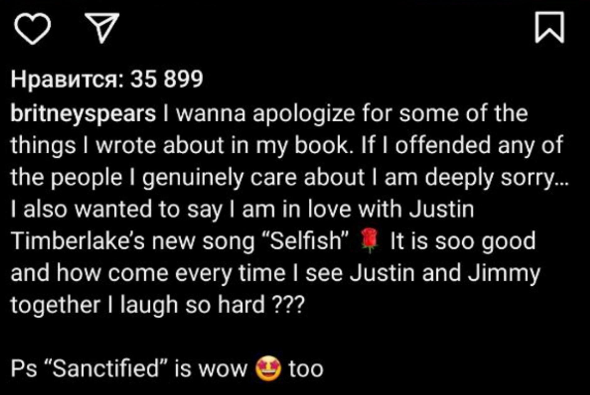 «Я хочу извиниться за вещи, о которых я написала в своей книге. Если я обидела кого-то из людей, которые мне искренне небезразличны, мне очень жаль... Я также хотела сказать, что влюблена в новую песню Джастина Тимберлейка Selfish», — заявила Бритни Спирс в инстаграме*.
