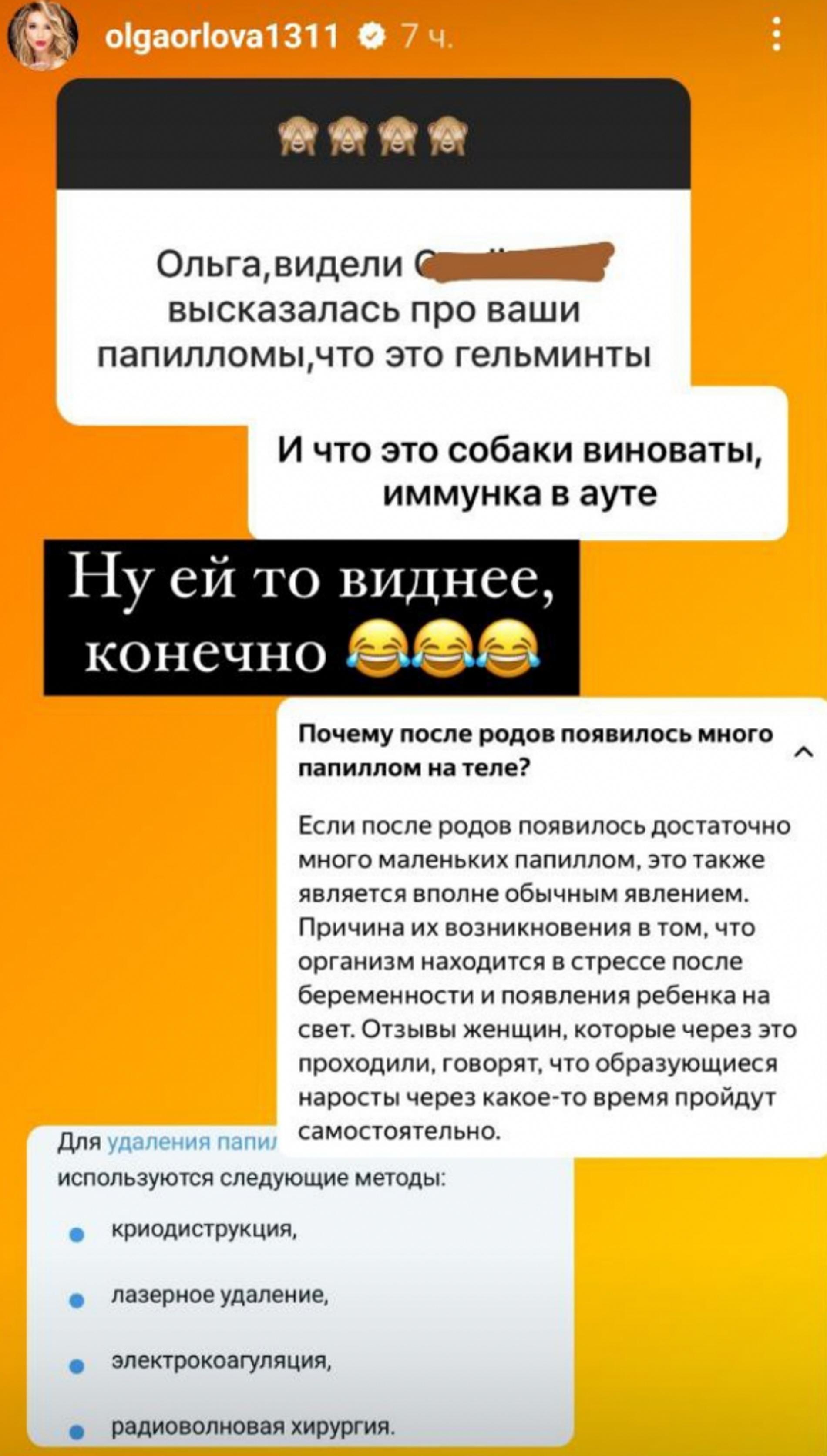 «Вы звезда в блоге по паразитам, пишут, что прыщи у вас от собак (паразитов)», — огорошили Ольгу в рубрике «Вопрос – ответ» в Инстаграме*. «Видели... высказалась про ваши папилломы, что это гельминты и что это собаки виноваты, иммунка в ауте», — передали подписчики экс-солистке «Блестящих».