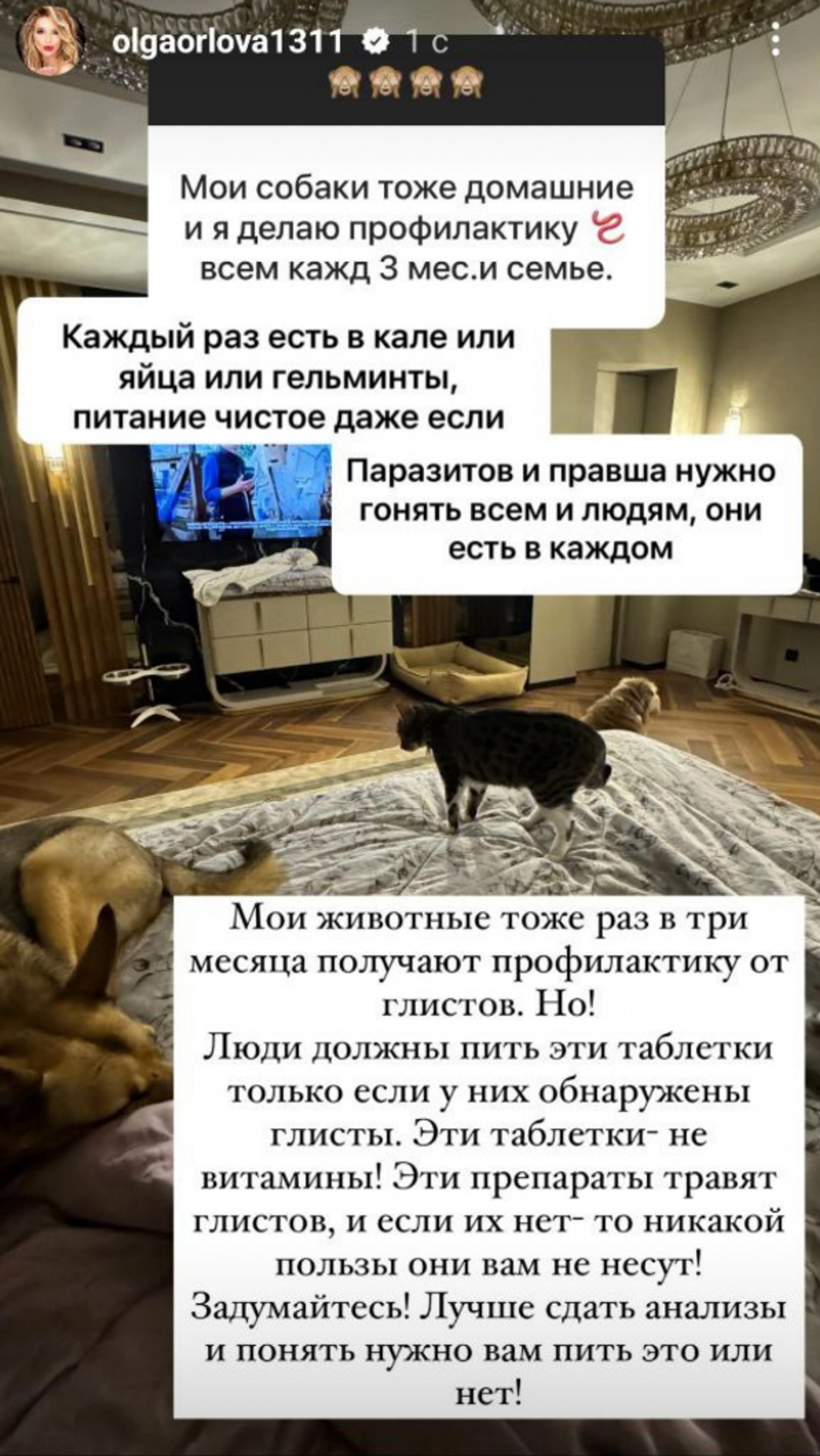 «Мои животные тоже получают профилактику от глистов. Но! Люди должны пить эти таблетки, только если у них обнаружены глисты. Эти таблетки не витамины!» — заявила Ольга Орлова подписчице, которая настоятельно порекомендовала ей пропить эти препараты для профилактики.