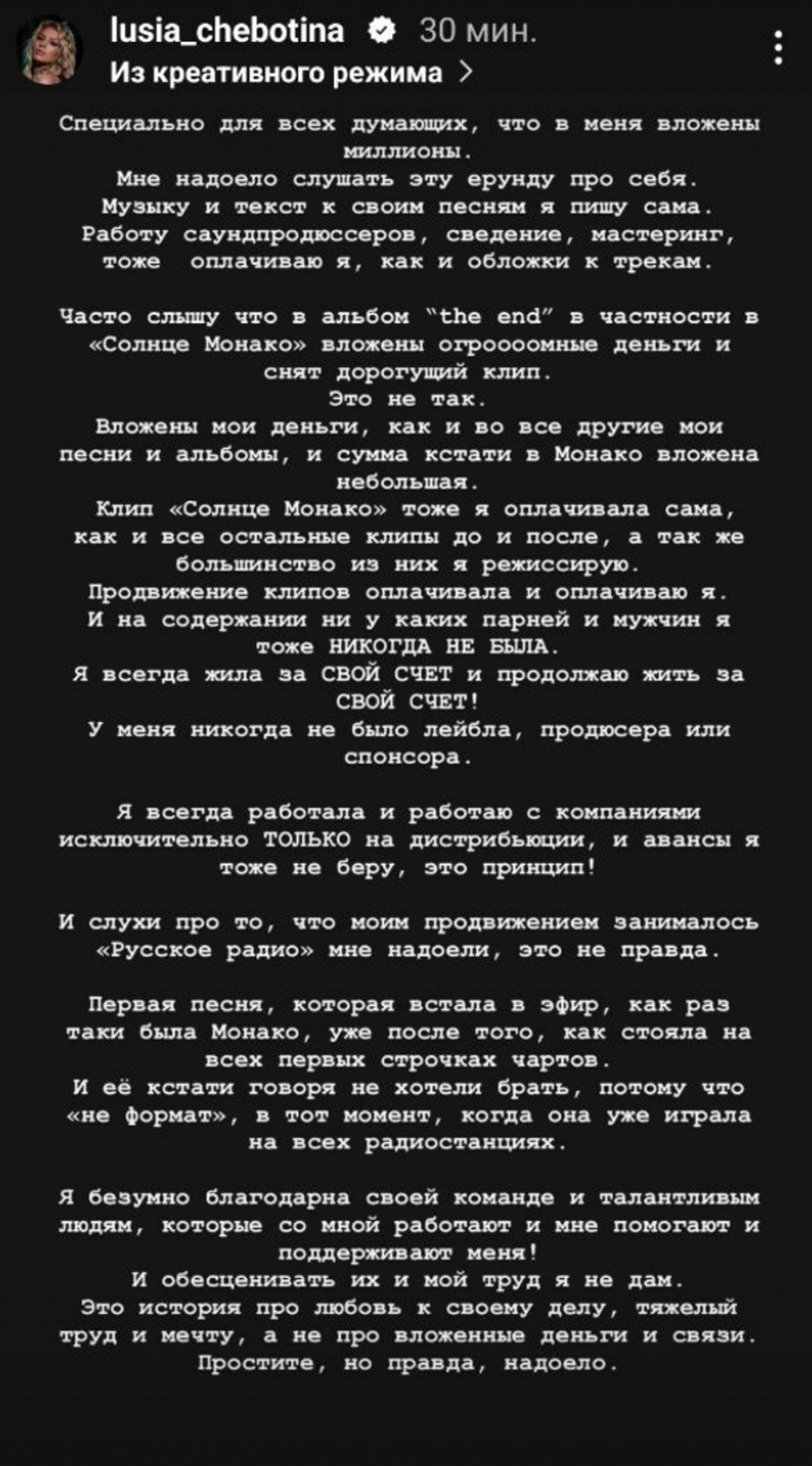 «Специально для всех думающих, что в меня вложены миллионы. Мне надоело слушать эту ерунду про себя. Музыку и текст к своим песням я пишу сама. Работу саундпродюсеров, сведение, мастеринг тоже оплачиваю я, как и обложки к трекам. Часто слышу, что в альбом “the end” и в частности в трек “Солнце Монако” вложены огромные деньги, снят дорогущий клип. Это не так. Вложены мои деньги, как и во все другие мои песни и альбомы, и сумма в “Монако” вложена небольшая. Клип “Солнце Монако” тоже я оплачивала сама, как и все остальные клипы до и после, а также большинство из них я режиссирую. Продвижение клипов оплачивала и оплачиваю я. И на содержании ни у каких парней и мужчин я тоже никогда не была. Я всегда жила за свой счет и продолжаю жить за свой счет!»