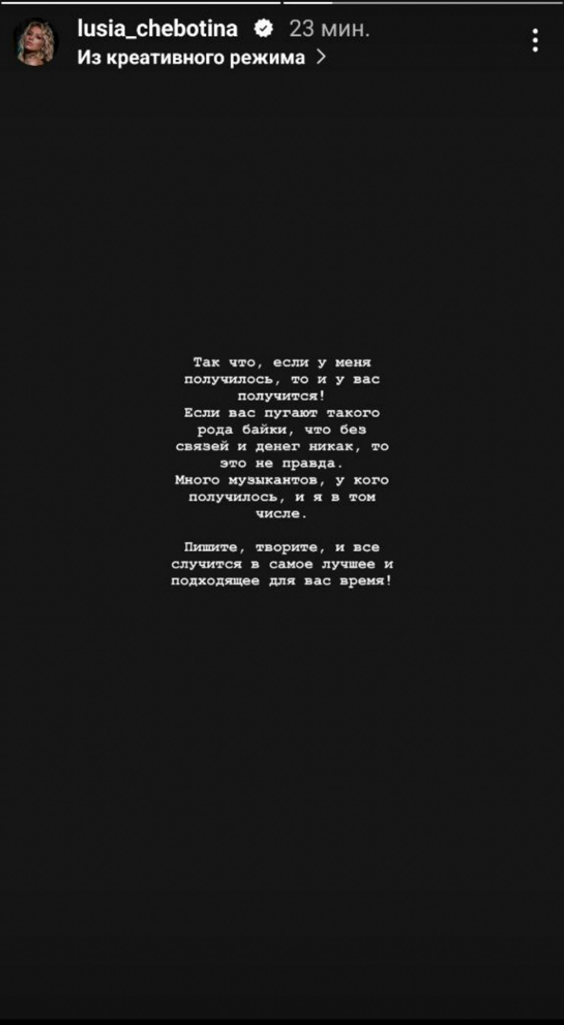 «Я безумно благодарна своей команде и талантливым людям, которые со мной работают и мне помогают, поддерживают! И обесценивать их и мой труд я не дам. Это история про любовь к своему делу, тяжелый труд и мечту, а не про вложенные деньги и связи. Простите, но надоело. Так что, если у меня получилось, то и у вас получится! Если вас пугают такого рода байки, что без связей и денег никак, то это неправда. Много музыкантов, у кого получилось, и я в том числе. Пишите, творите, все случится в самое лучшее и подходящее для вас время!»