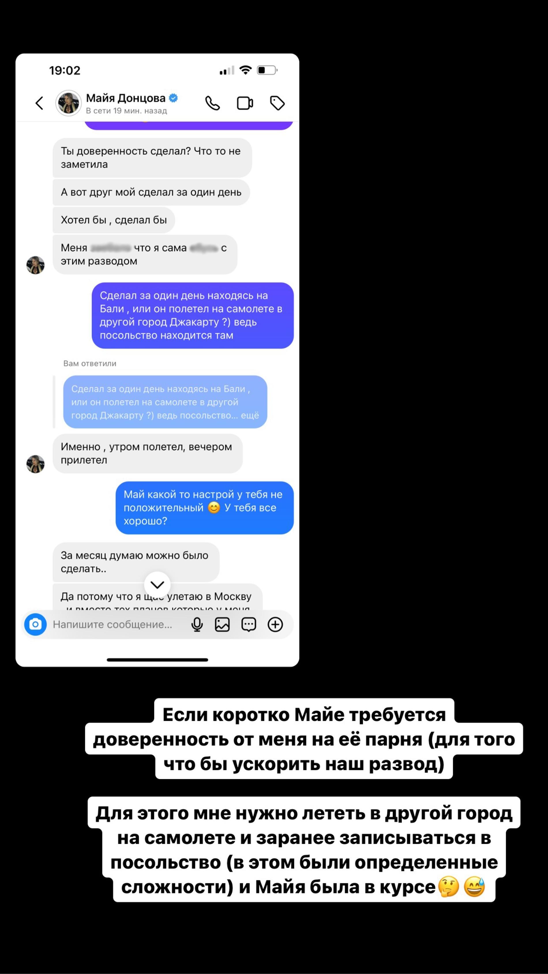 Инициировала его Донцова. Она опубликовала сторис, в которых резко осудила бывшего возлюбленного. Она рассказала, что развестись они не могут из-за бездействия Алексея, который никак не займется оформлением документов. Майя специально прилетела к Купину на Бали для решения этого вопроса: чтобы не летать несколько раз в Москву в течение трех месяцев, Алексей должен был отправиться буквально в соседний индонезийский город и оформить там доверенность. С ней Майя без участия Леши сможет завершить процесс в России.