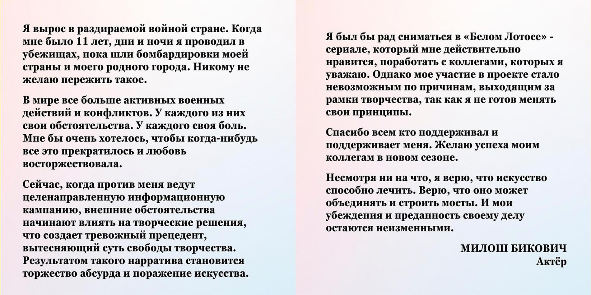 Однако неделю назад министерство иностранных дел Украины публично раскритиковало HBO за решение привлечь к съемкам актера, поддерживающего Россию. После этого назначение Биковича подверглось массовой критике в социальных сетях. А сегодня стало известно, что телеканал принял решение больше не сотрудничать с актером. Ситуацию прокомментировал сам Бикович в запрещенной сети.