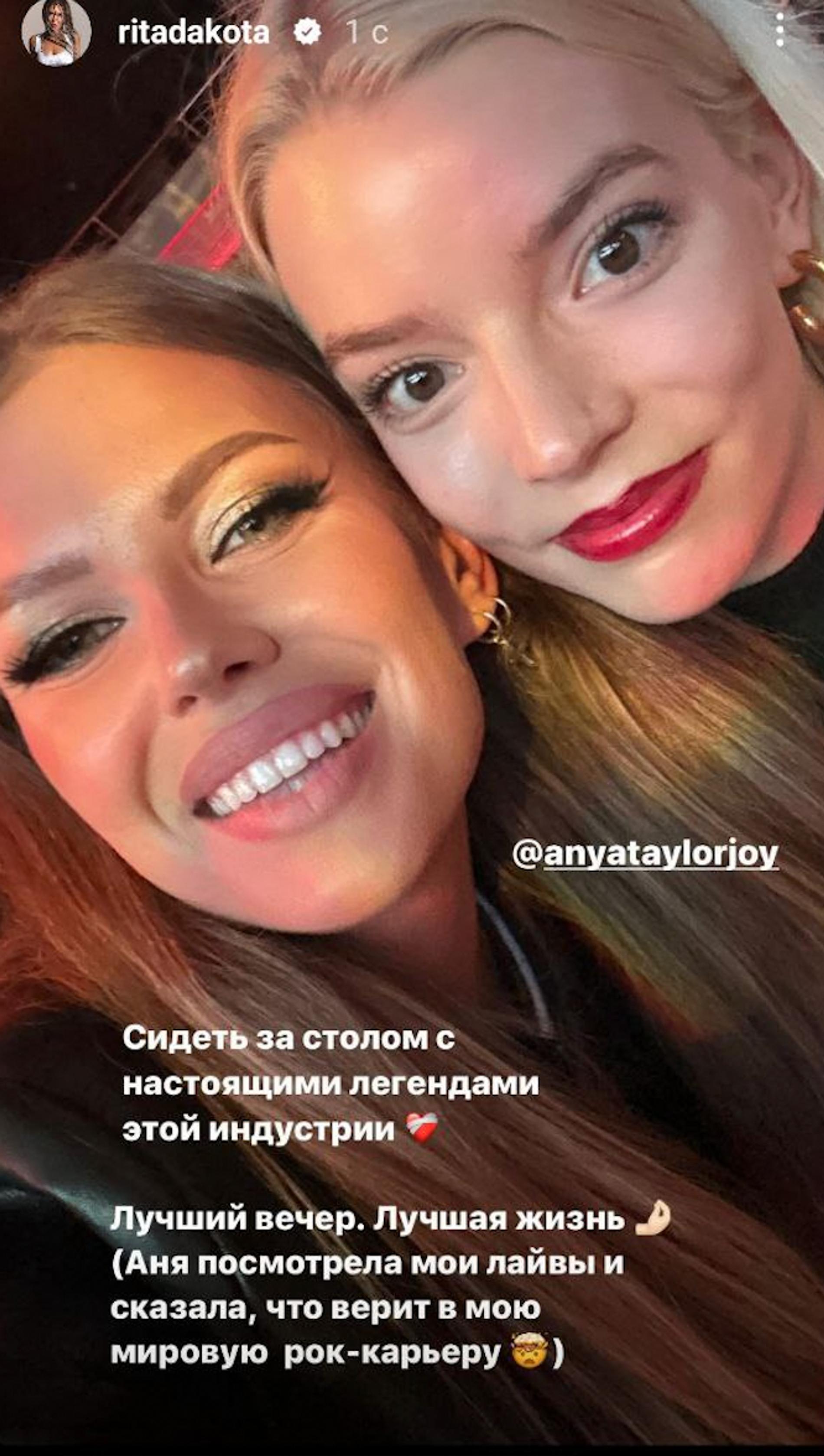 Певица сообщила, что побывала на ежегодной вечеринке просмотра «Грэмми», которую проводит Стивен Тайлер. Там по традиции присутствовали звезды А-листа. «Это мой первый официальный выход в Лос-Анджелесе. Лучший вечер. Лучшая жизнь. Сидеть за одним столом с настоящими легендами индустрии», — поделилась впечатлениями Рита в запрещенной сети. В сторис Рита предоставила подписчикам фотоотчет, с кем из мировых знаменитостей ей удалось пообщаться. Среди них: Меган Фокс и Аня Тейлор-Джой. По словам Риты, звезда сериала «Ход королевы» посмотрела ее лайвы и сказала, что верит в ее мировую рок-карьеру.