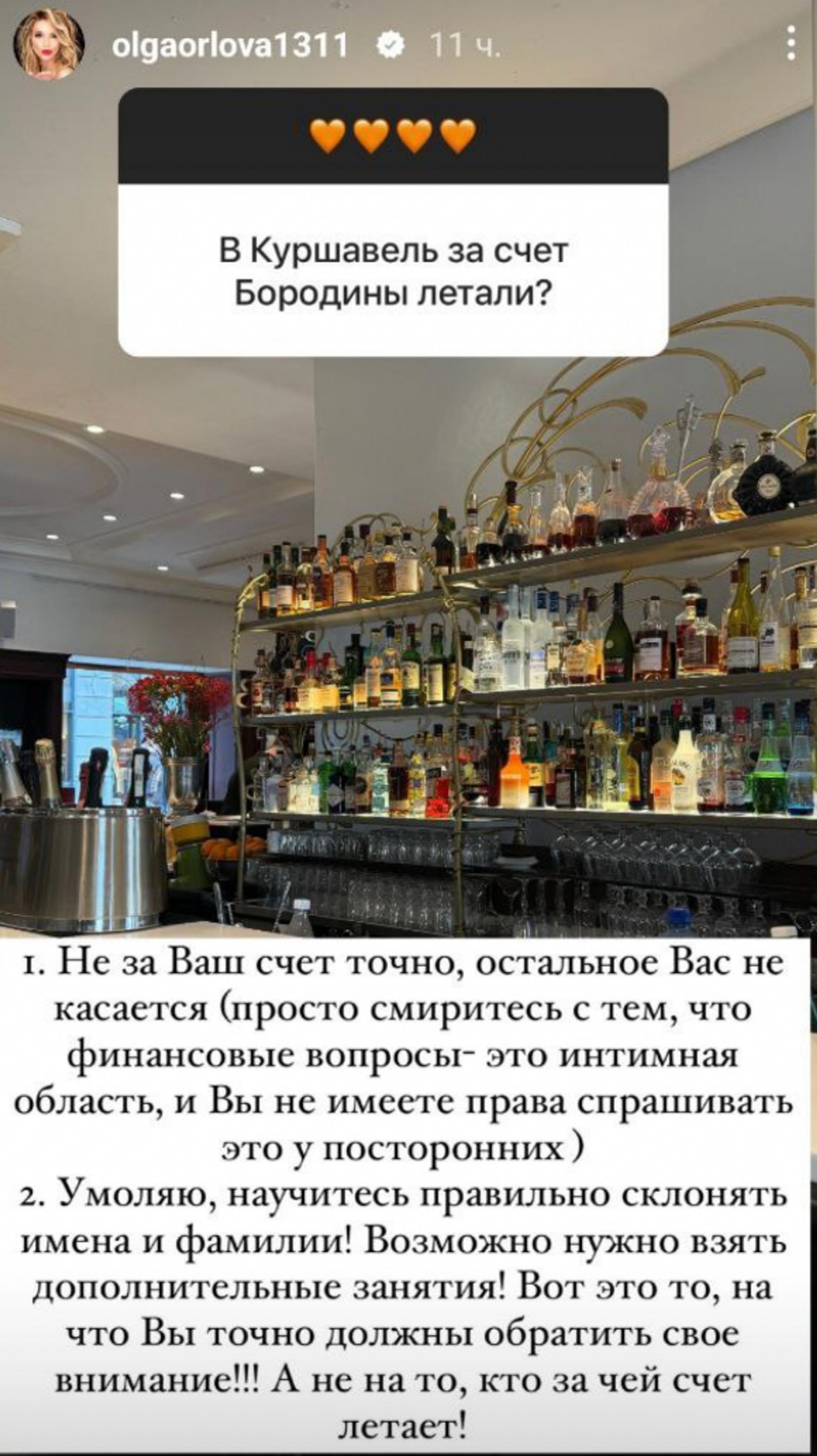 «Не за ваш счет точно, остальное вас не касается (просто смиритесь с тем, что финансовые вопросы — это интимная область, и вы не имеете права спрашивать это у посторонних). Научитесь правильно склонять имена и фамилии! Возможно, нужно взять дополнительные занятия. Вот это то, на что вы точно должны обратить свое внимание. А не на то, кто за чей счет летает!» — написала Ольга Орлова в Инстаграме*. И с ней трудно не согласиться!
