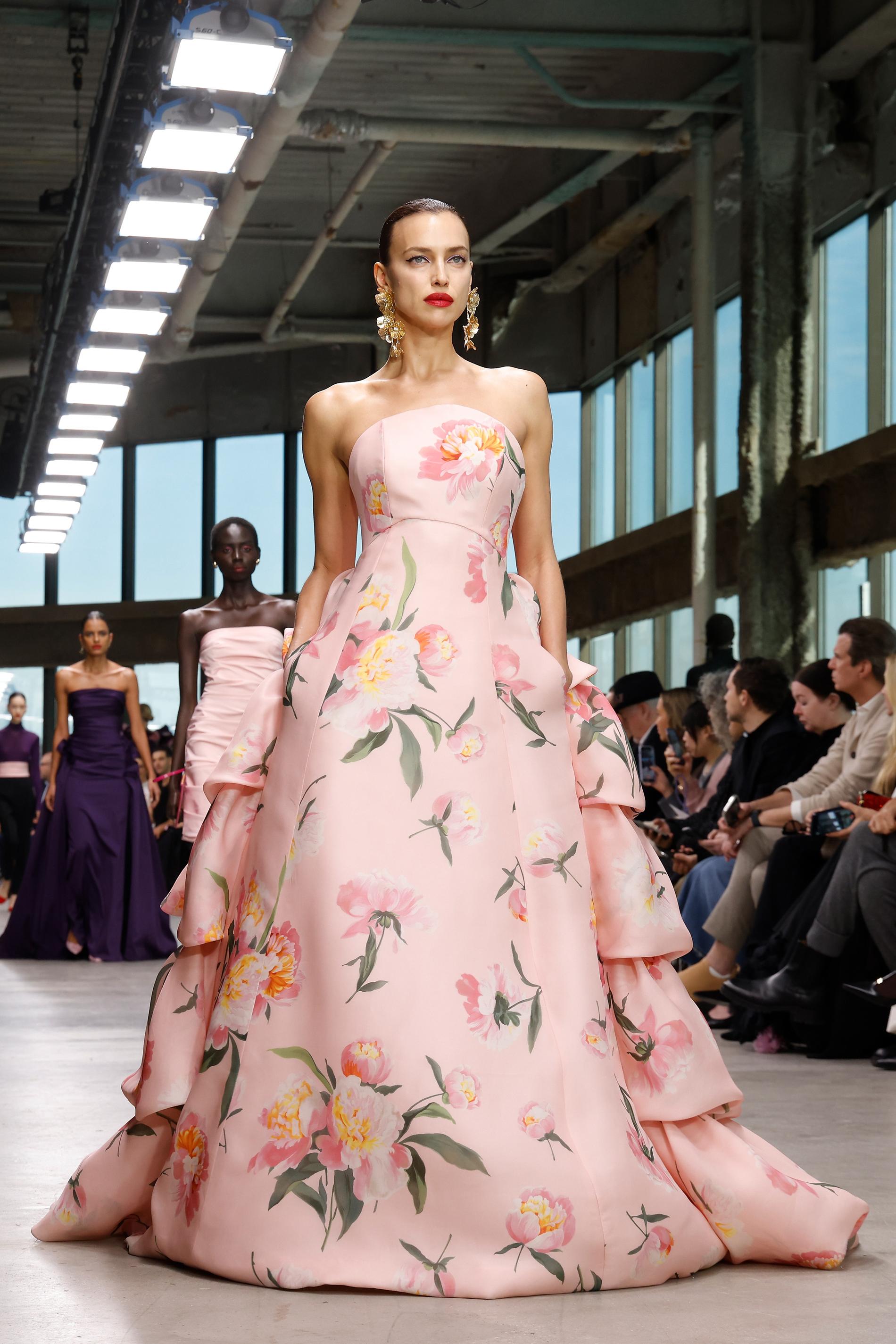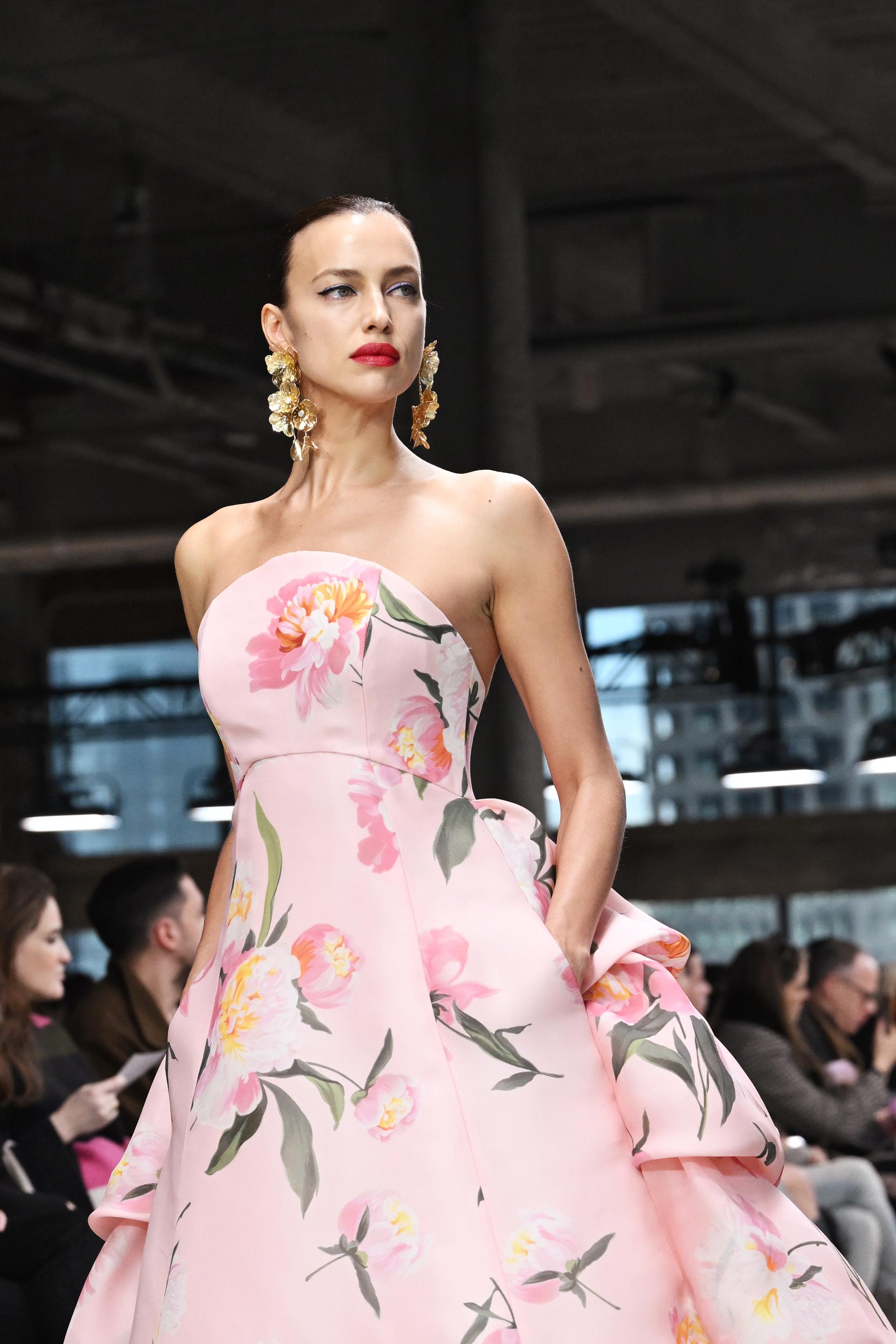 На показе Carolina Herrera Ирину одели в нежно-розовое платье с цветочным принтом — не знаем, как вы, а мы, глядя на наряд, почувствовали приближение весны. Образ дополнили массивные серьги золотистого цвета и бессмертная классика — роковой красный на губах.