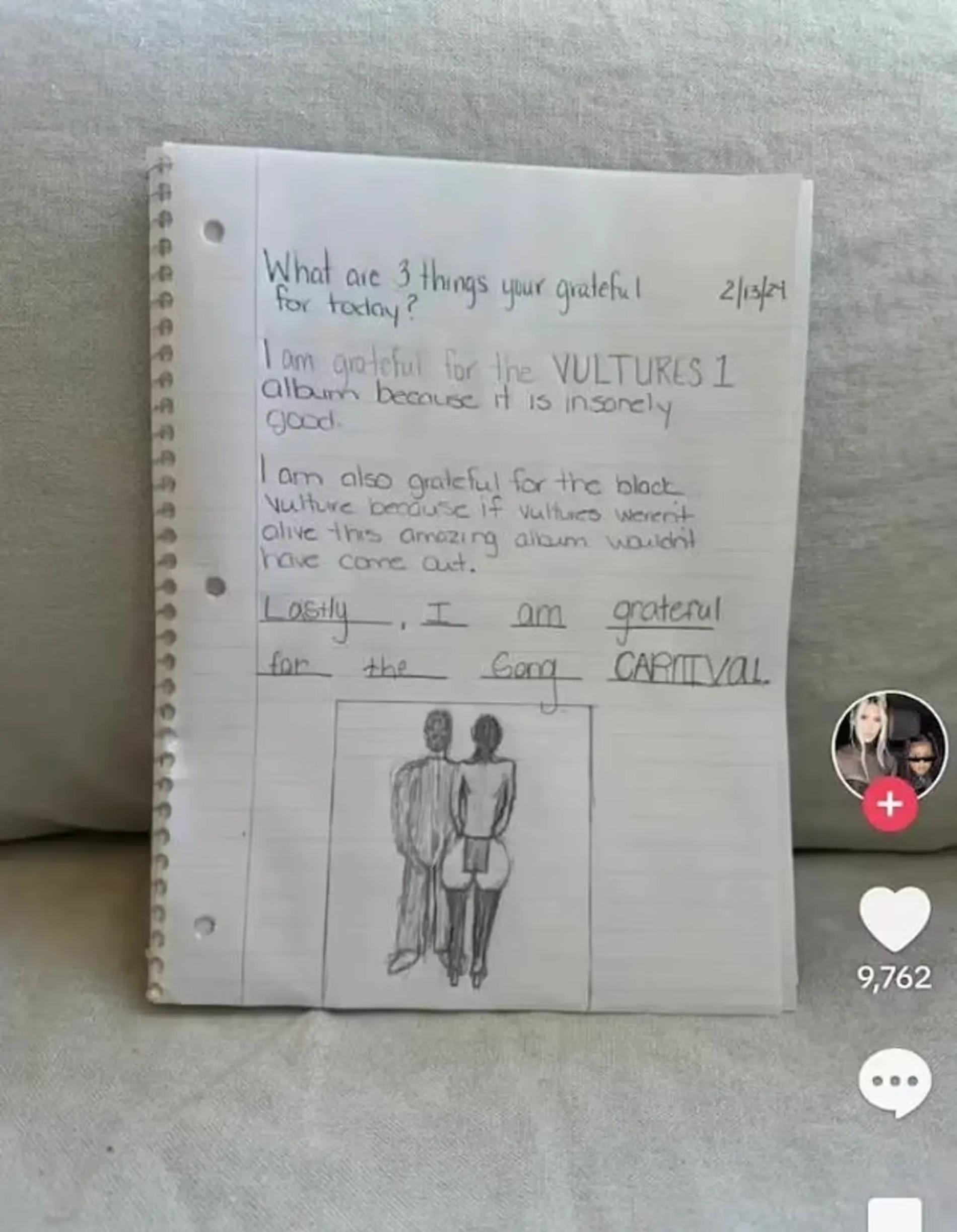 Вчерашним вечером в личном аккаунте в TikTok Норт Уэст, старшая дочь Ким и Канье, опубликовала выдержку из собственного дневника, где нарисовала обложку к папиному свежему альбому с полуголой Бьянкой. Напомним, что на изображении Ценсори повернута спиной к зрителям, а из одежды на ней лишь крошечное нижнее белье. Через пару часов публикация исчезла из аккаунта.