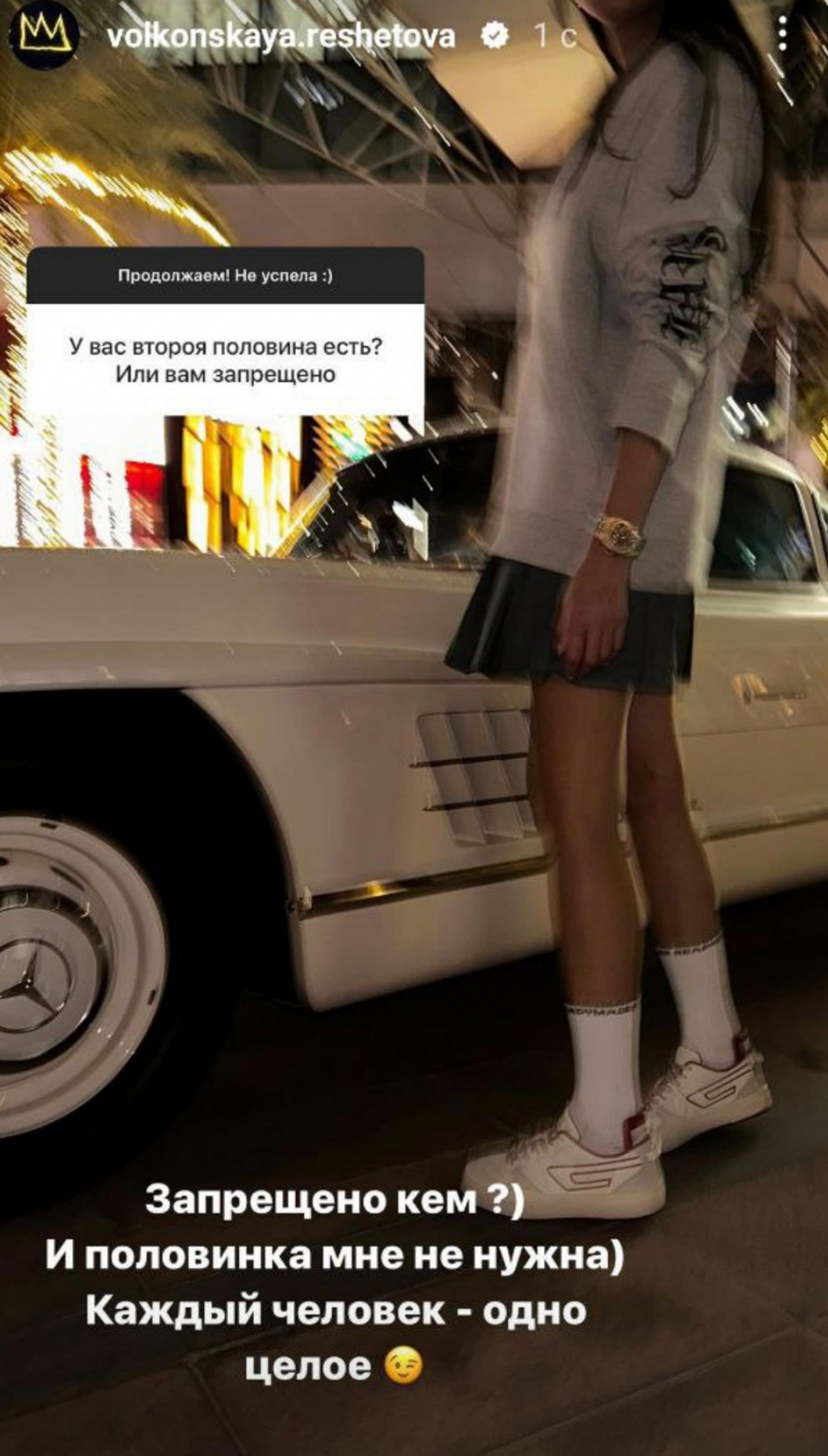 «У вас вторая половина есть? Или вам запрещено?» — спросили накануне у бывшей девушки Тимати. «Запрещено кем?» — с улыбкой ответила вопросом на вопрос Настя. Она объяснила, что теория половинок ей вообще не близка в случае отношений. «Половинка мне не нужна. Каждый человек — одно целое», — считает Анастасия Решетова. Трудно с ней не согласиться!