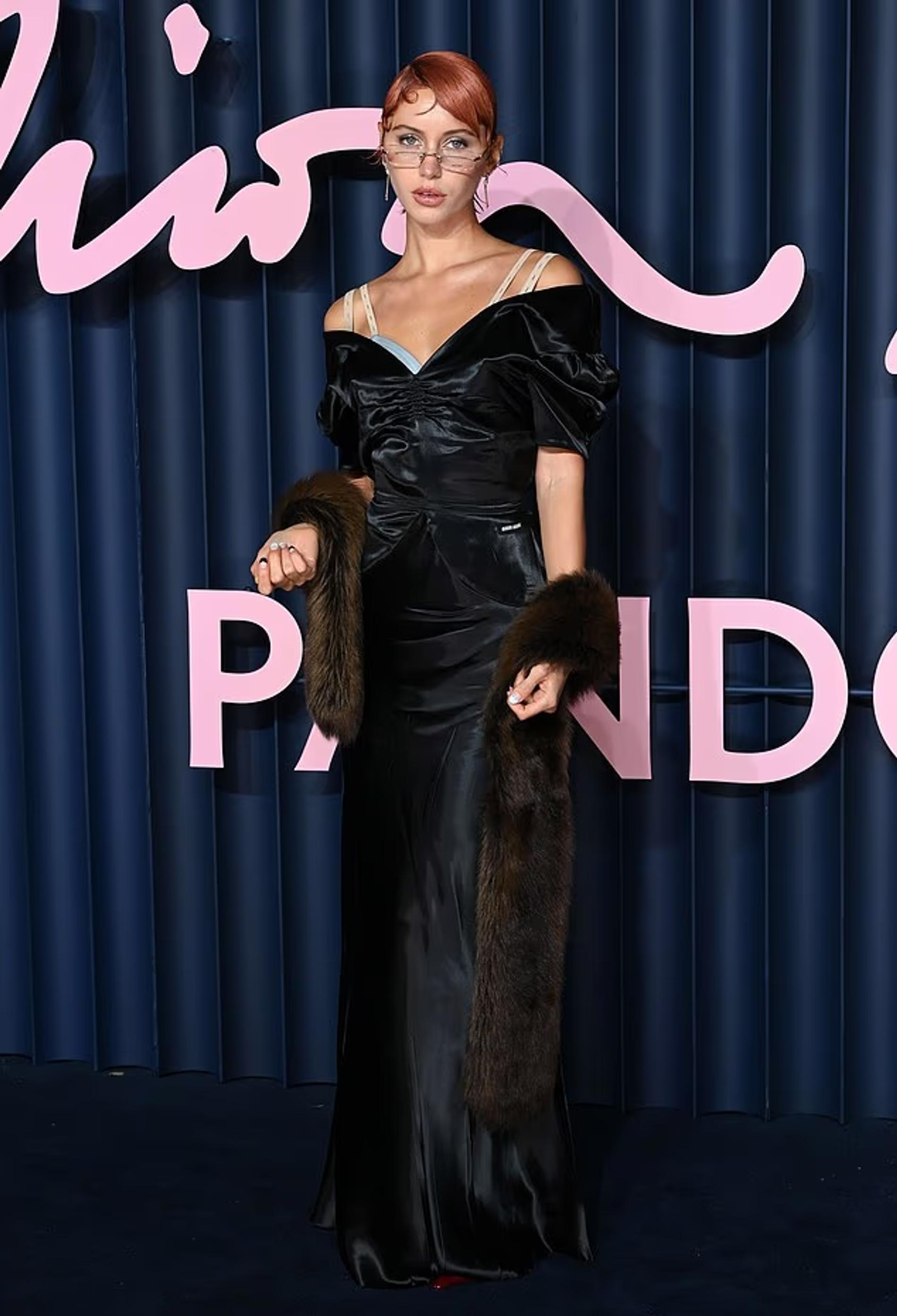 Модель уложила длинную челку набок и подчеркнула образ прямоугольными очками. На красной дорожке она появилась в черном атласном платье с открытыми плечами, драпированным лифом и юбкой в пол.